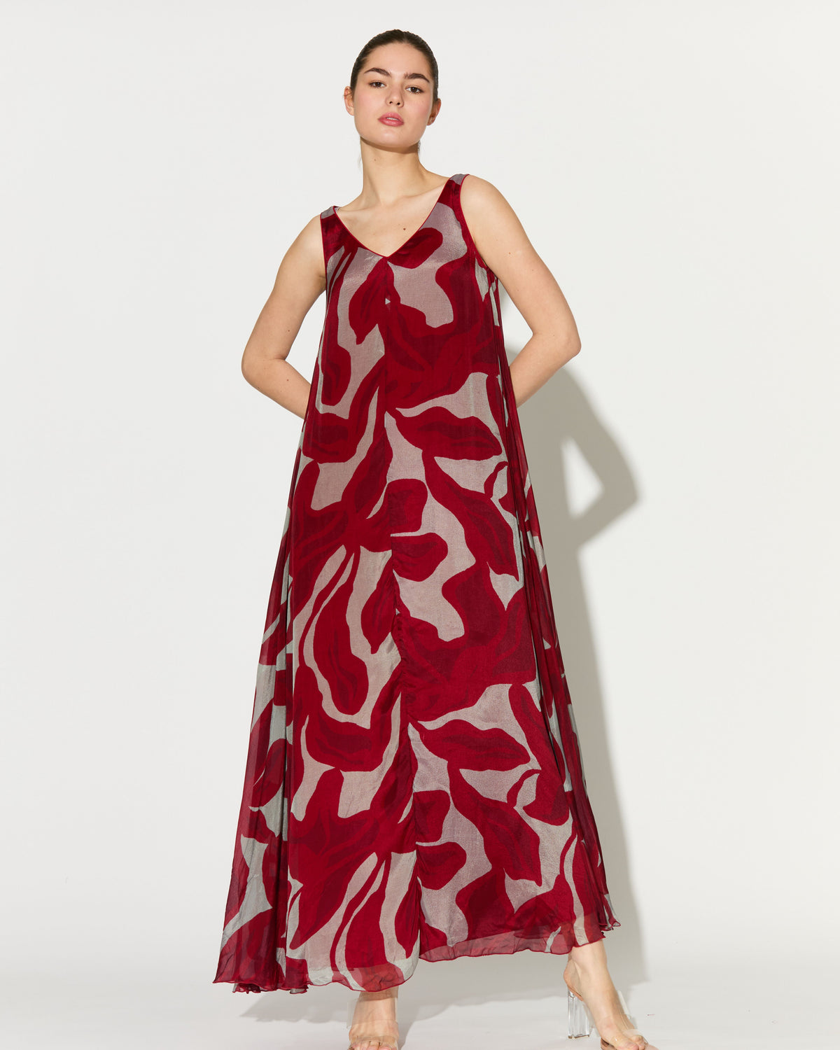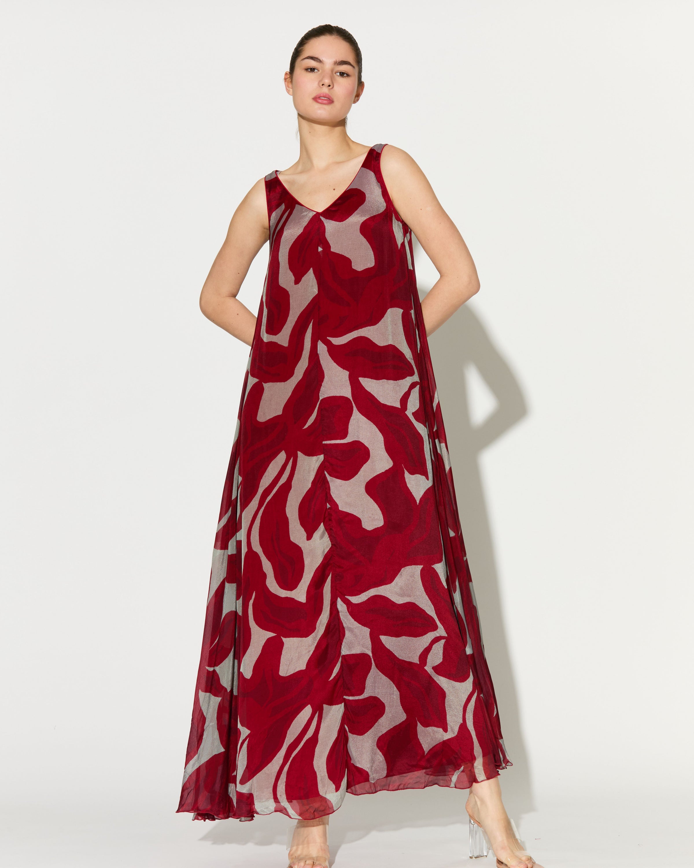 BEIGE AND HOT PINK FLORAL SLEEVELESS LONG DRESS
