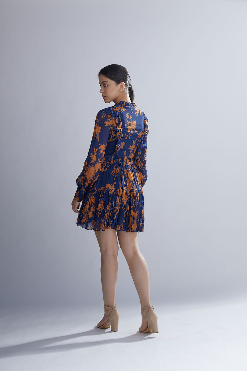 BLUE AND ORANGE FLORAL FRILL SHORT DRESS