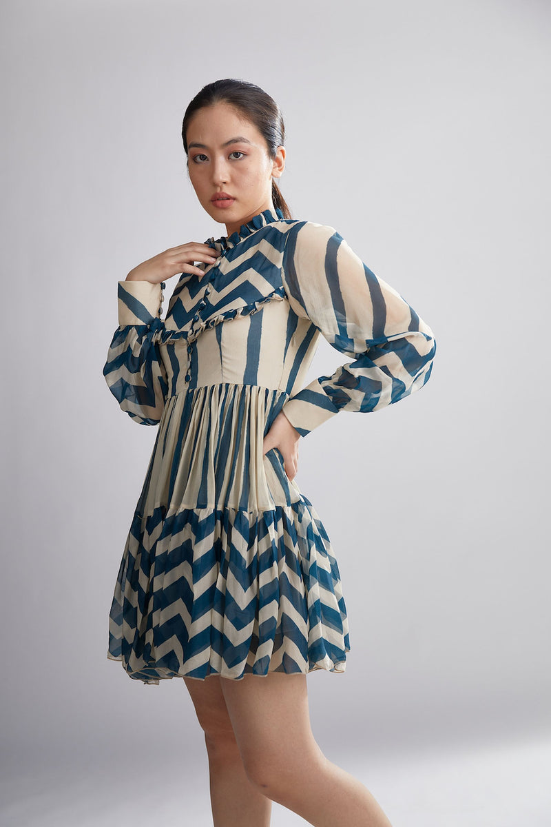 TEAL AND CREAM STRIPE ZIG ZAG SHORT DRESS