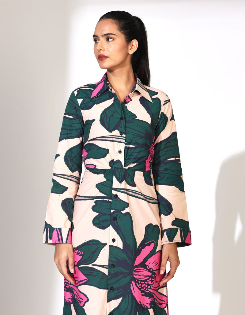 DARK GREEN & OFF WHITE FLORAL SHIRT DRESS