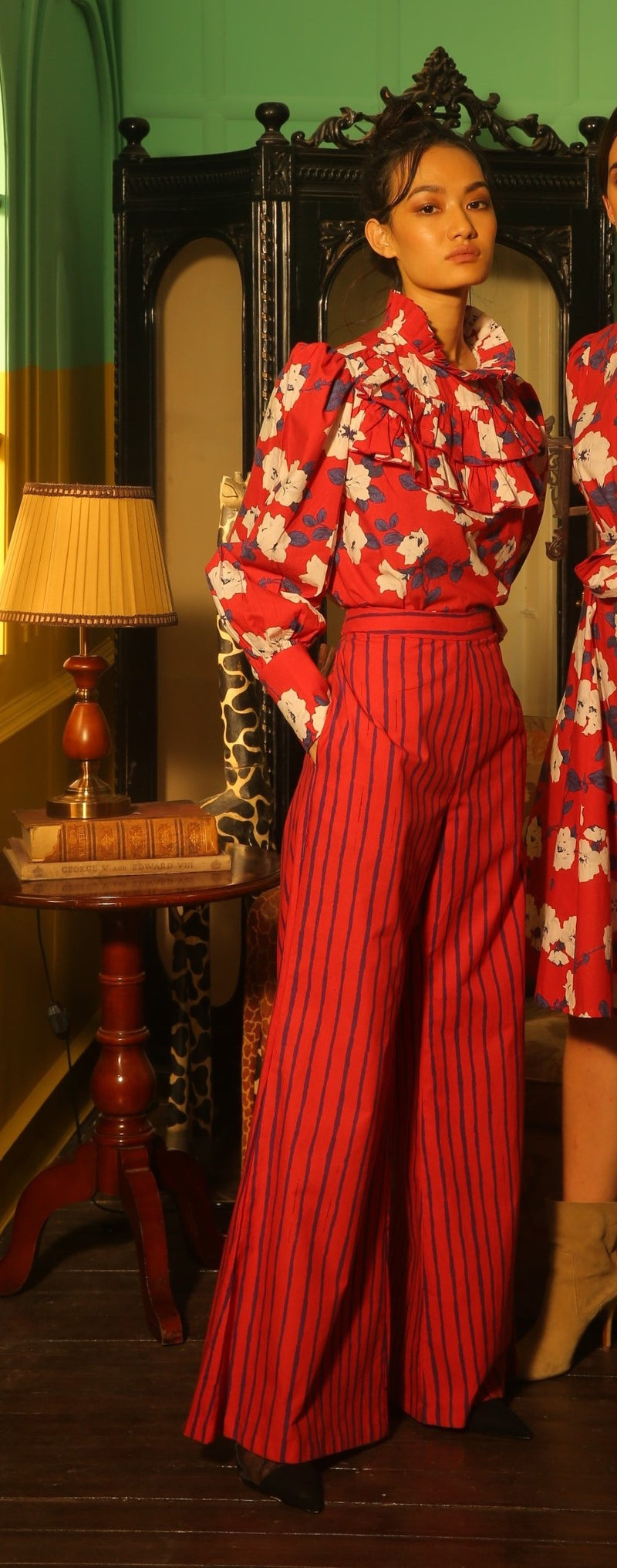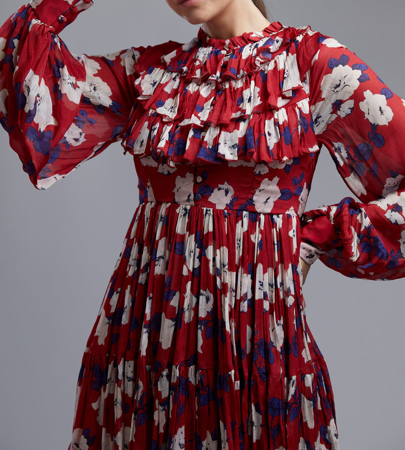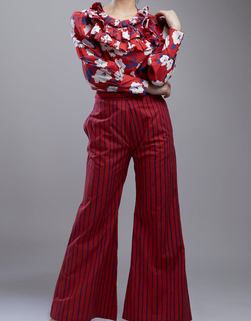 RED, BLUE AND WHITE FLORAL FRILL COLLAR SHIRT