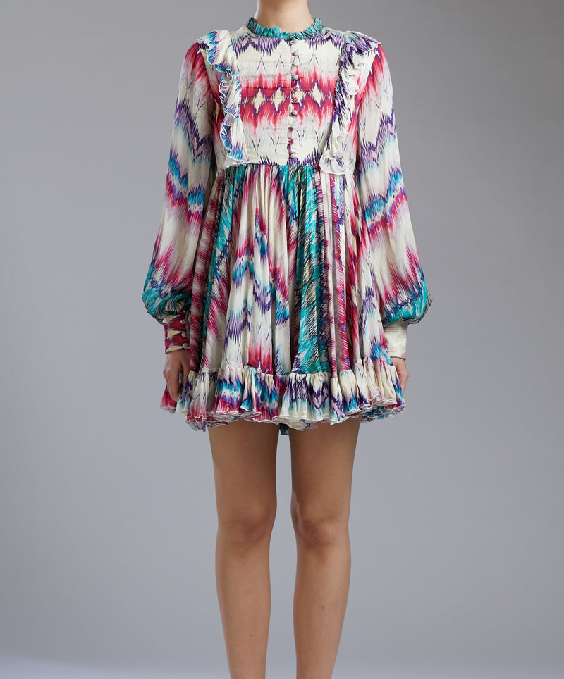 BEIGE AND PINK MOTIF SHORT DRESS WITH BELT