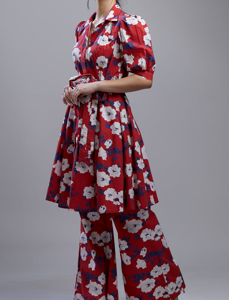RED, BLUE AND WHITE FLORAL LONG SHIRT DRESS