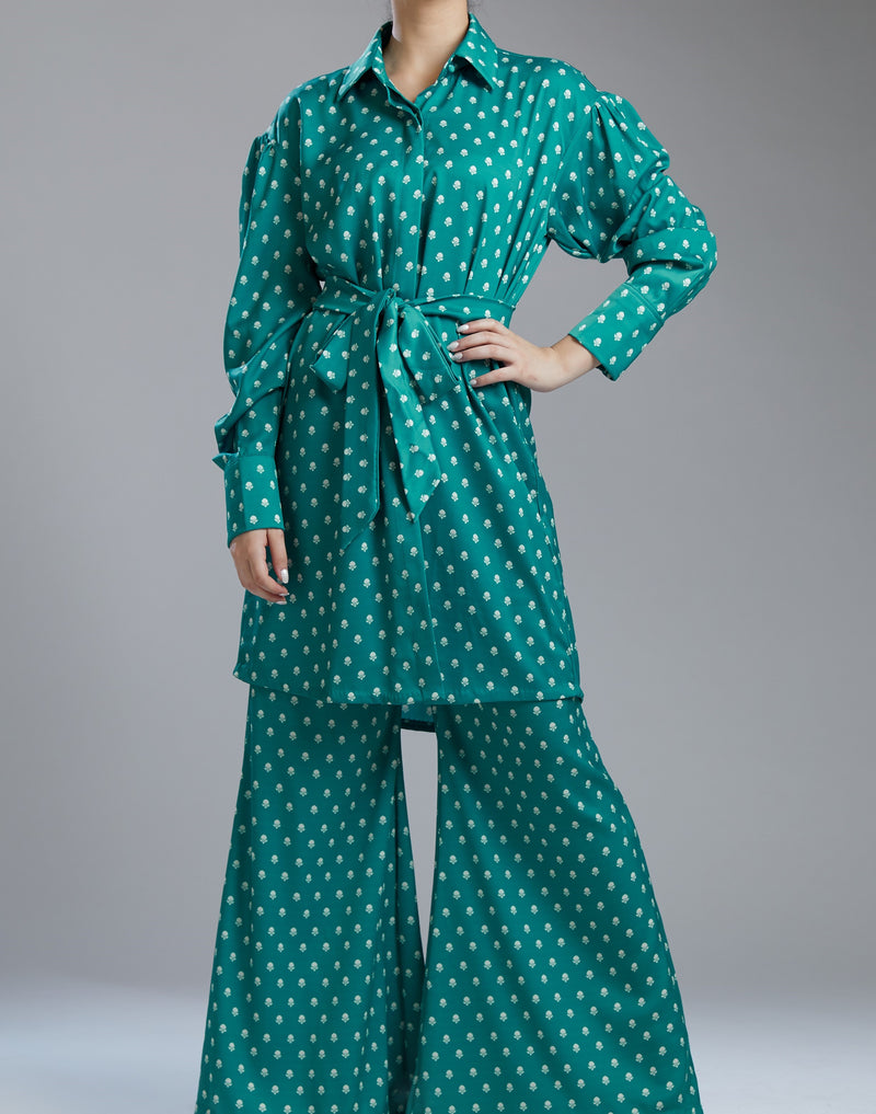 SEA GREEN AND CREAM POLKA LONG WRAP SHIRT WITH BELT