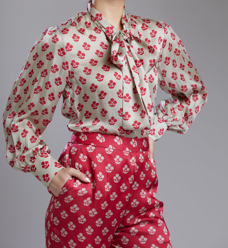 BEIGE AND PINK MOTIF BOW TIE SHIRT