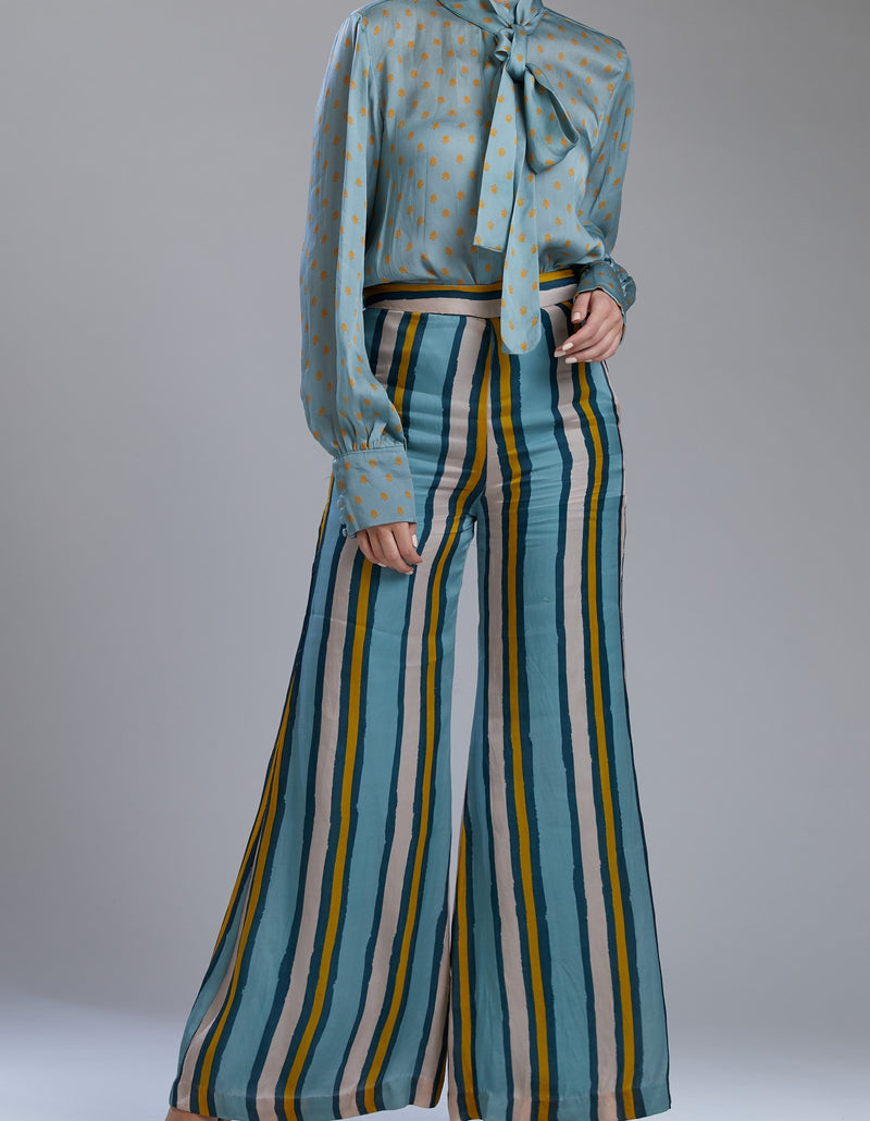 SEA GREEN AND CREAM POLKA BELL BOTTOM PANTS