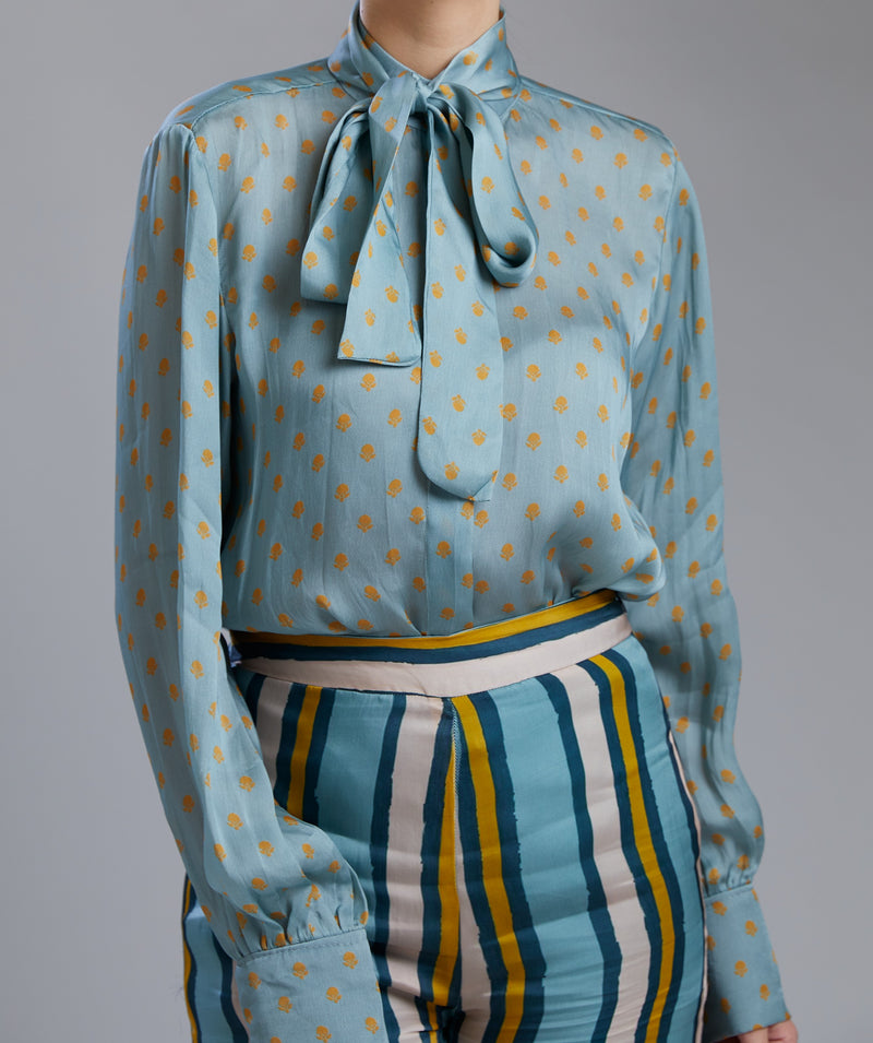 SKY BLUE AND MUSTARD POLKA BOW TIE SHIRT