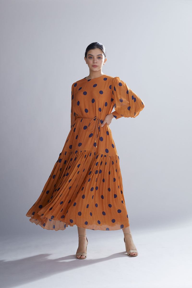 BLUE AND ORANGE POLKA DOT PLEATED TOP