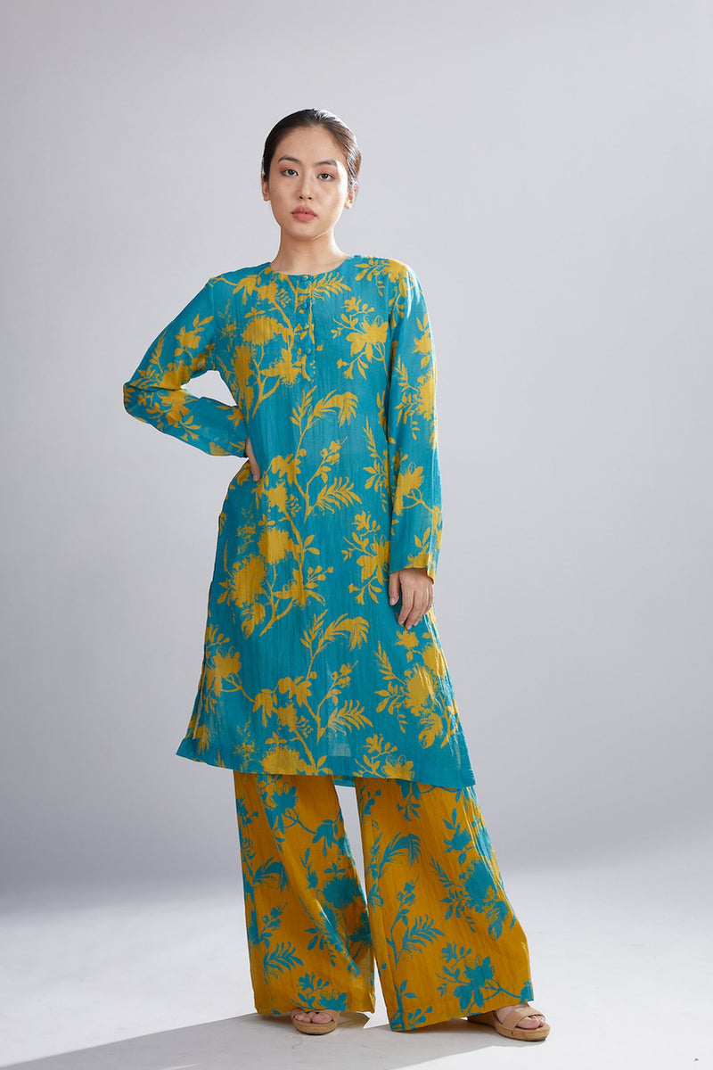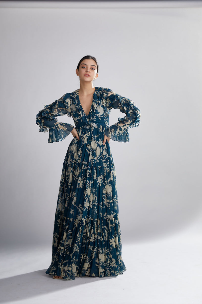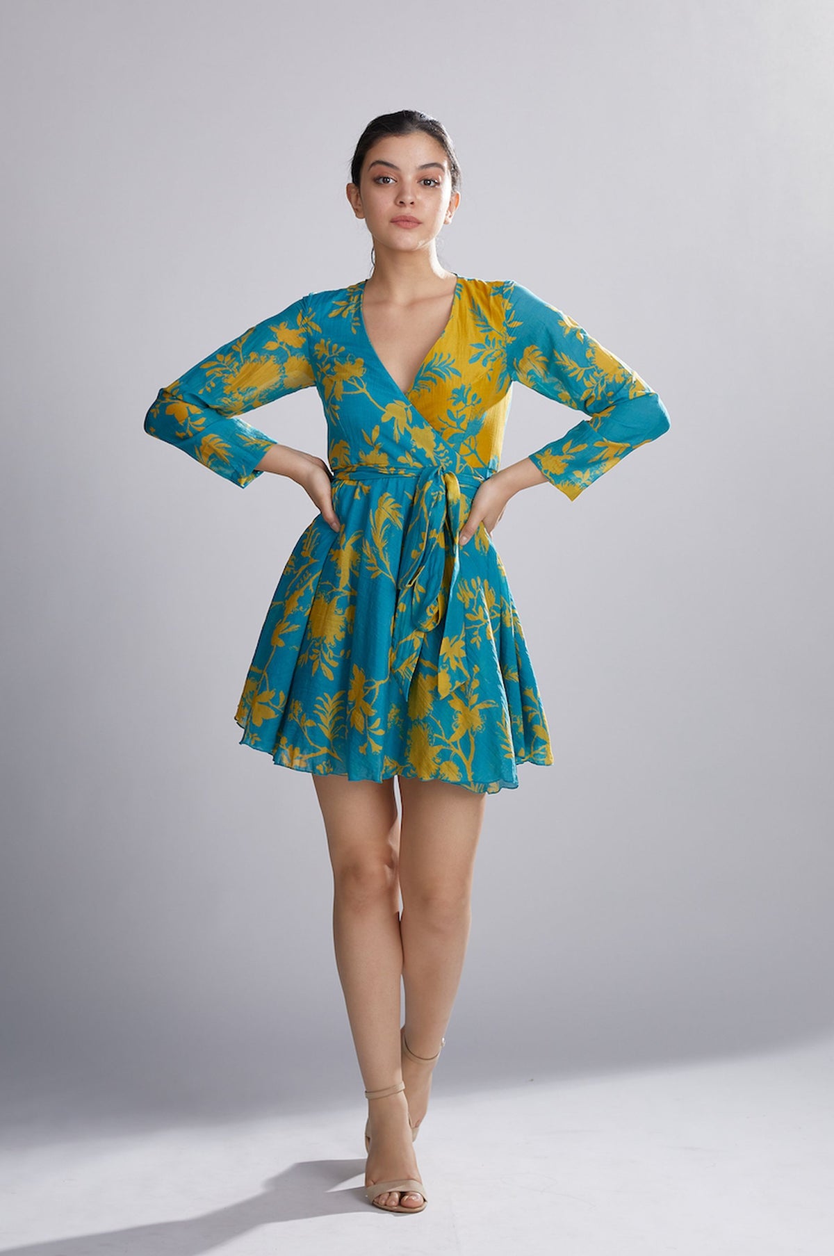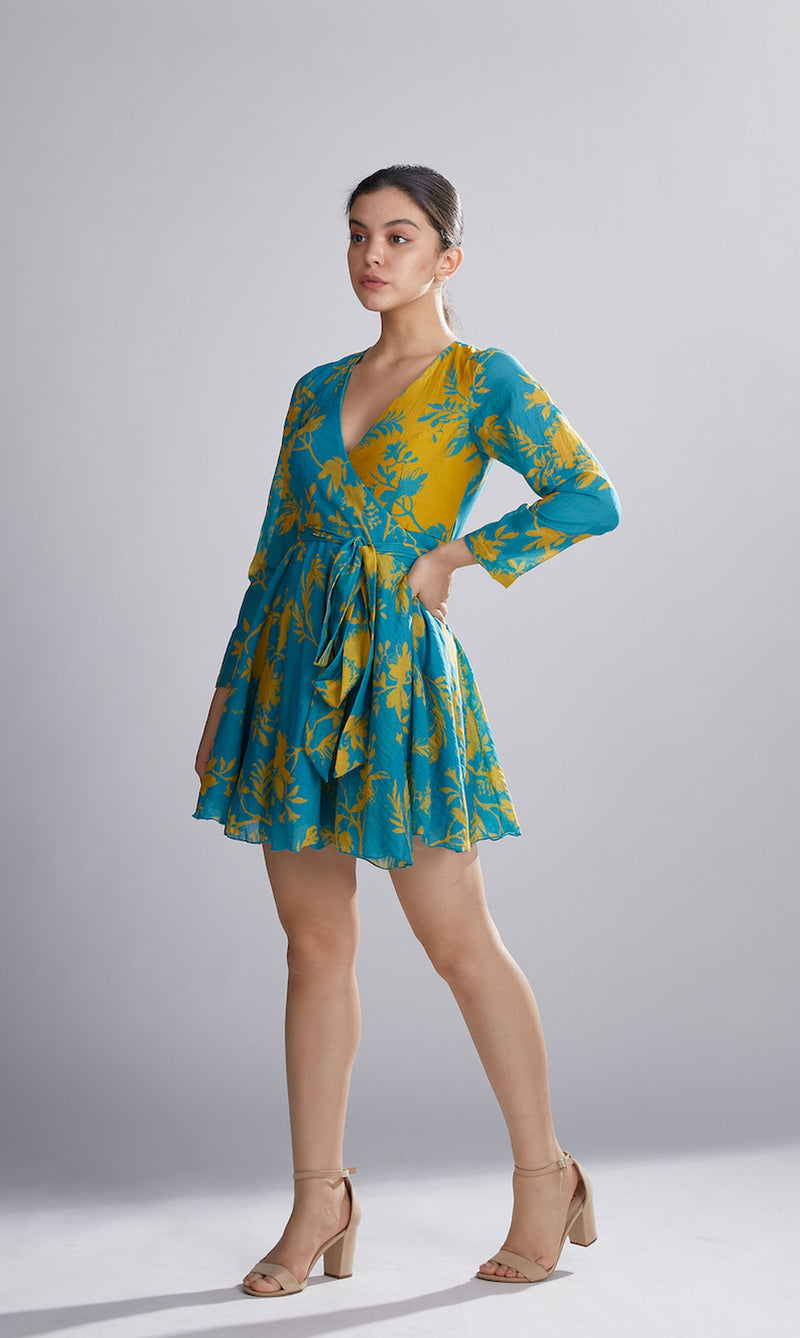 BLUE AND MUSTARD DUAL FLORAL WRAP DRESS