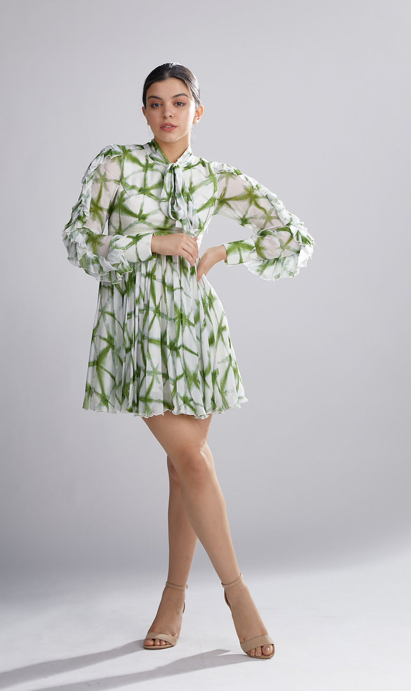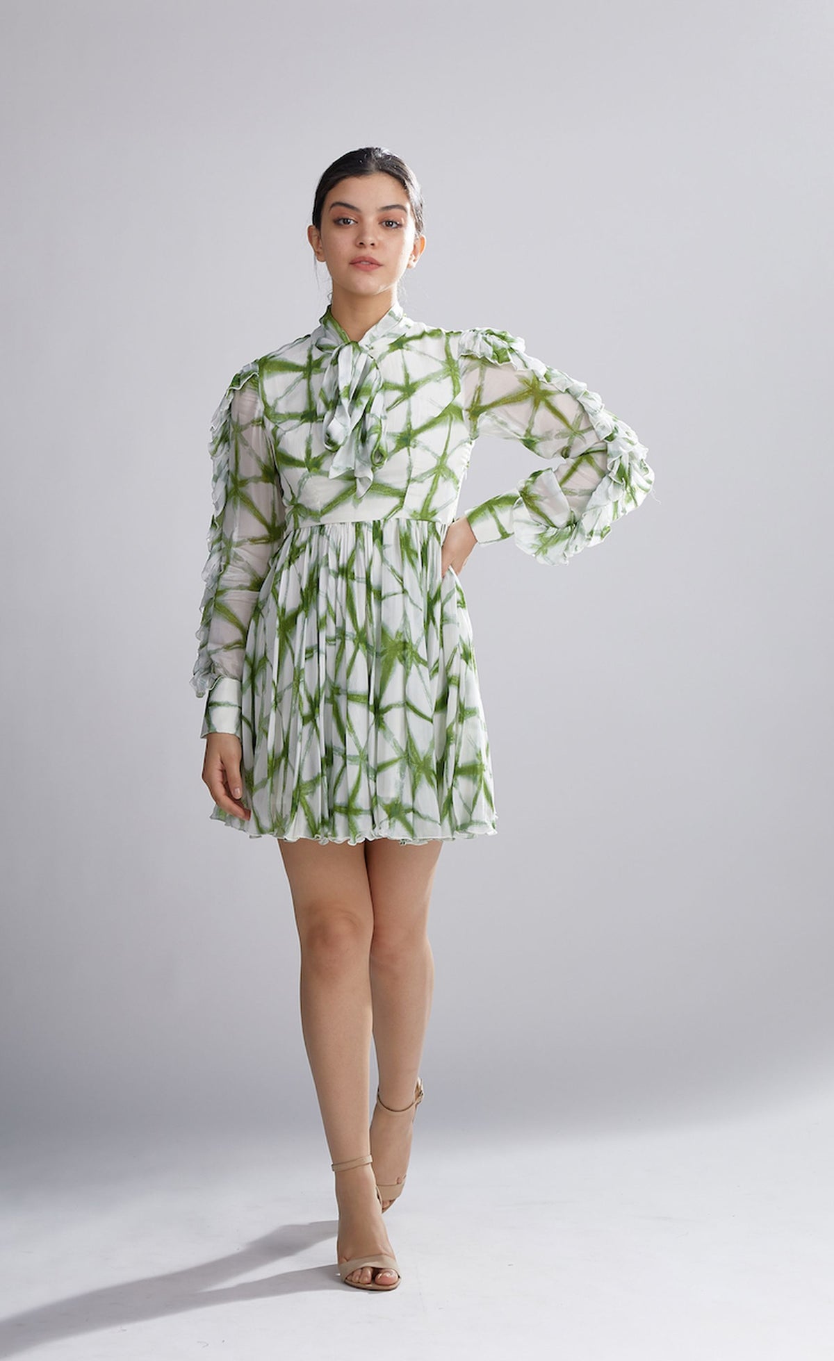 GREY YELLOW AND CREAM ZIG ZAG FRILL SHORT DRESS