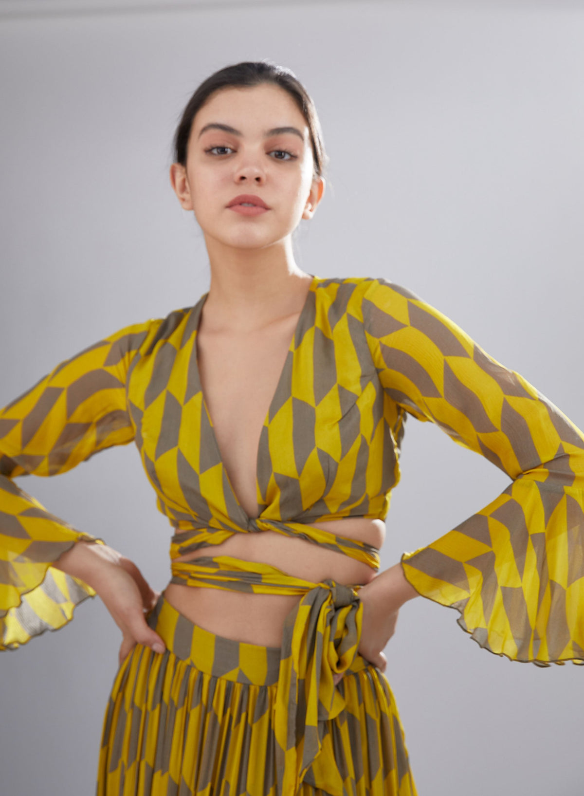 CREAM AND YELLOW GEOMETRIC CRINCKLED SKIRT