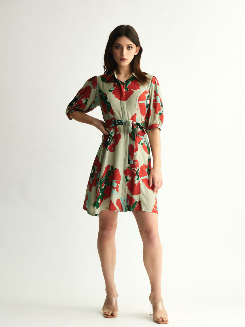 GREEN AND CREAM FLORAL SHIRT DRESS