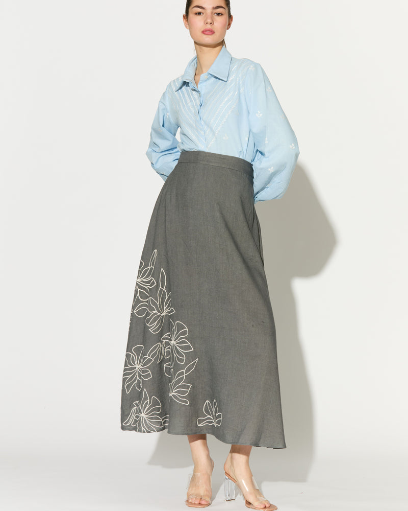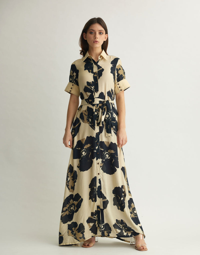 BEIGE AND GREEN FLORAL LONG SHIRT DRESS