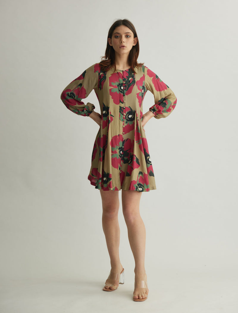 BEIGE, PINK AND GREEN FLORAL SHIRT DRESS