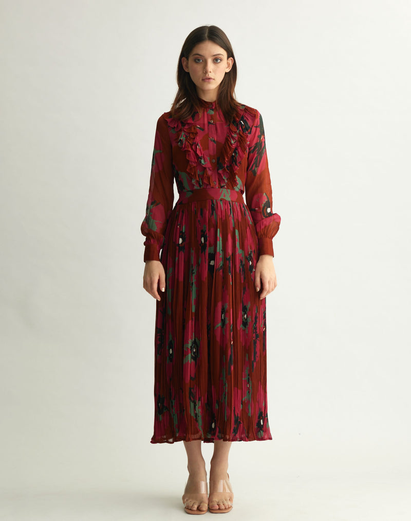 RED, MUSTARD AND BLACK FLORAL LONG SHIRT DRESS