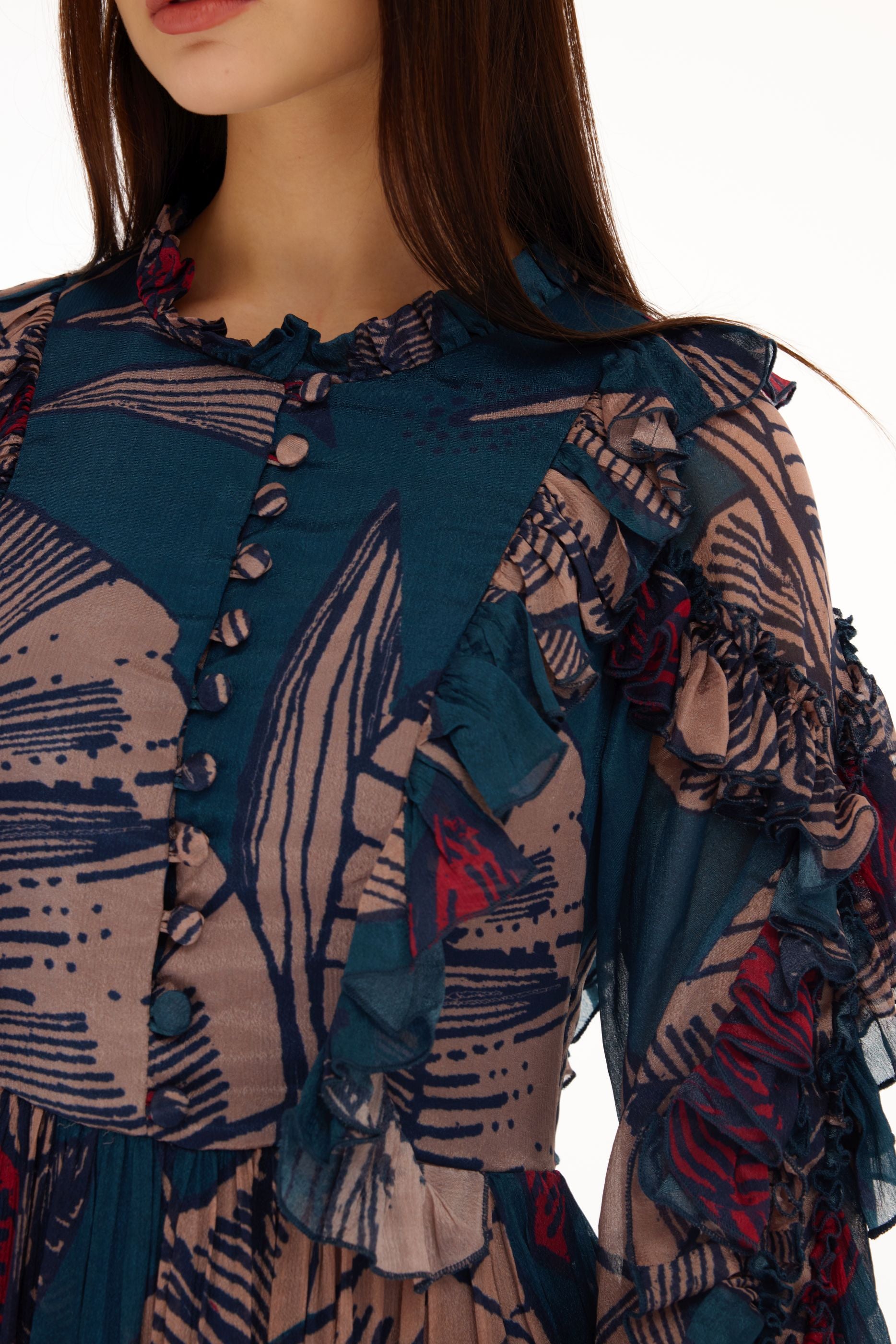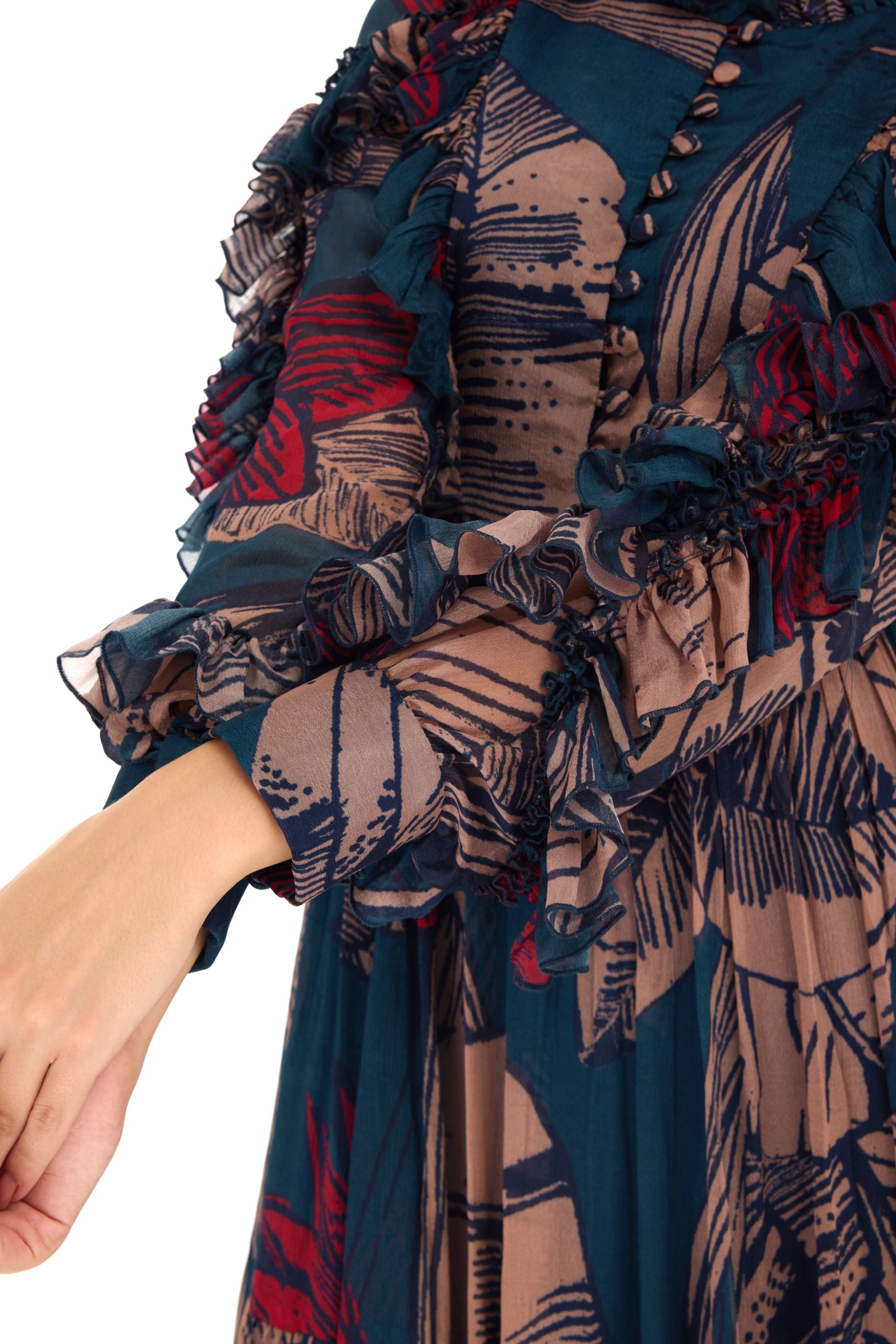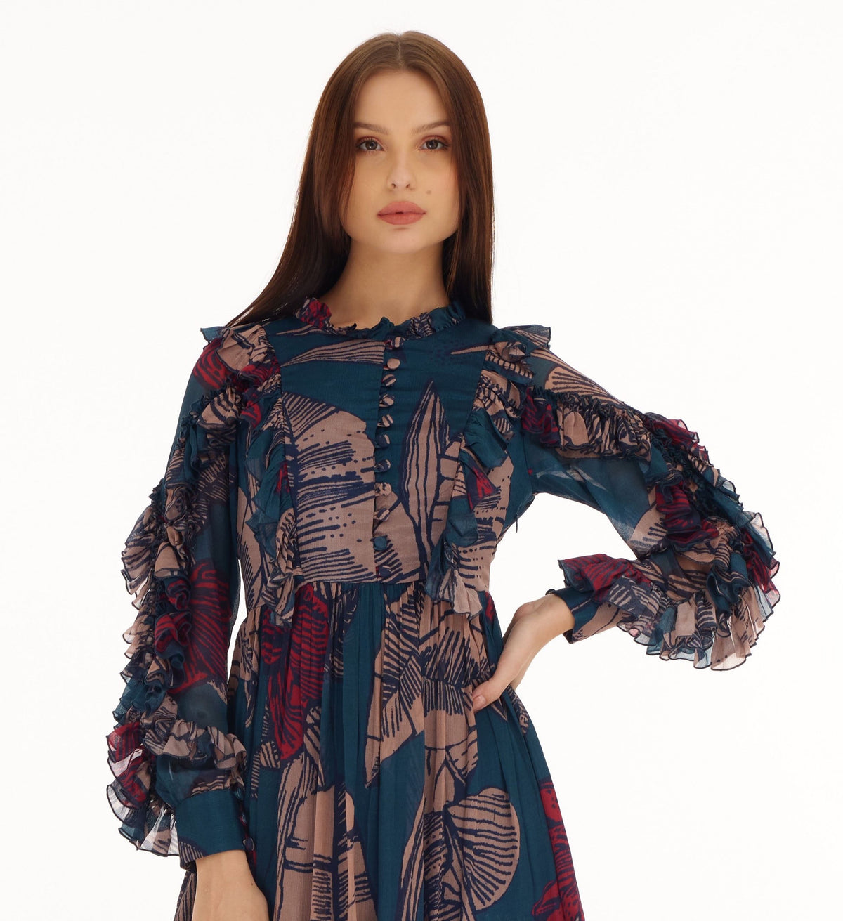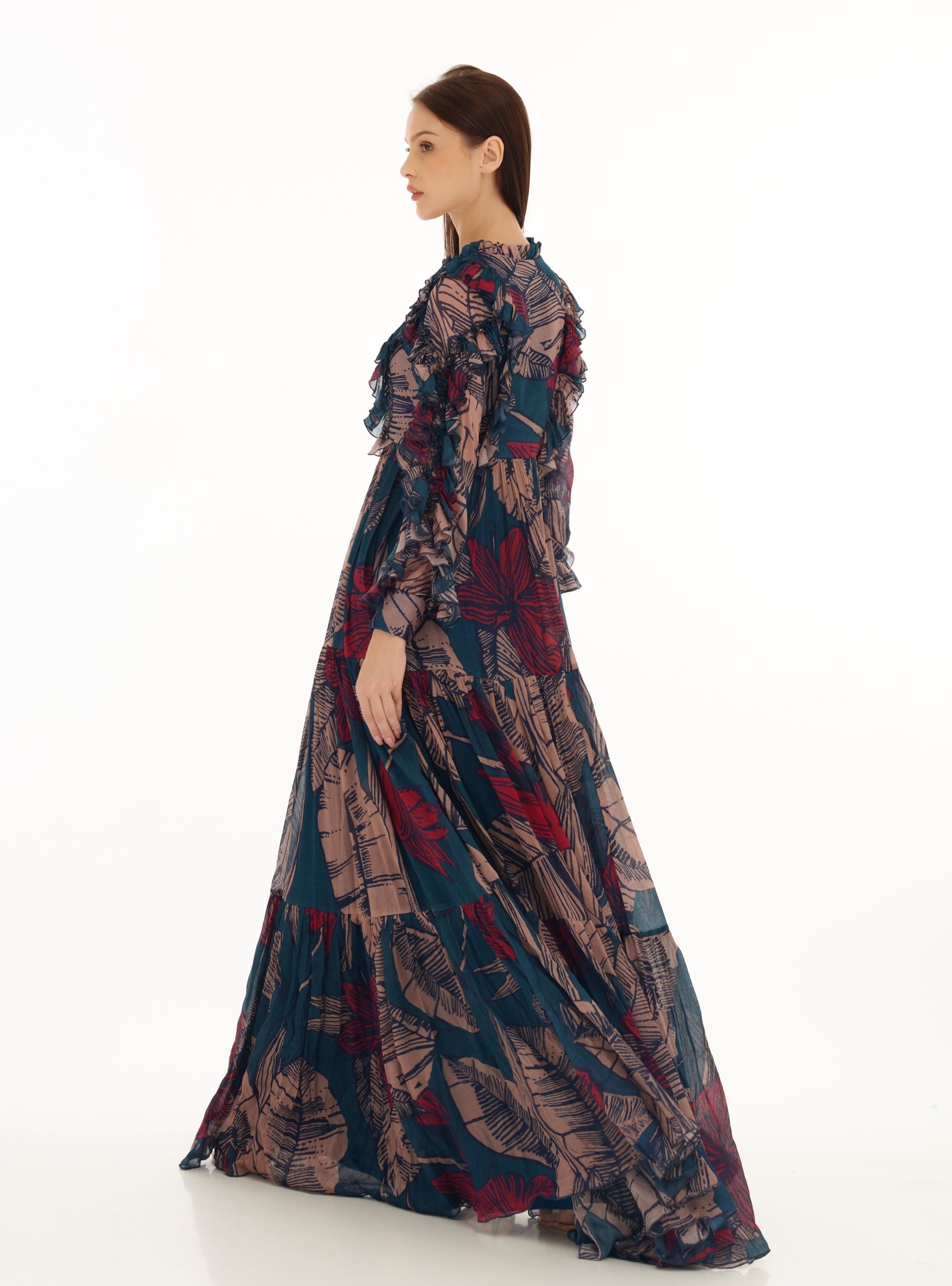 BLUE, ORANGE & RED FLORAL FRILL LONG DRESS