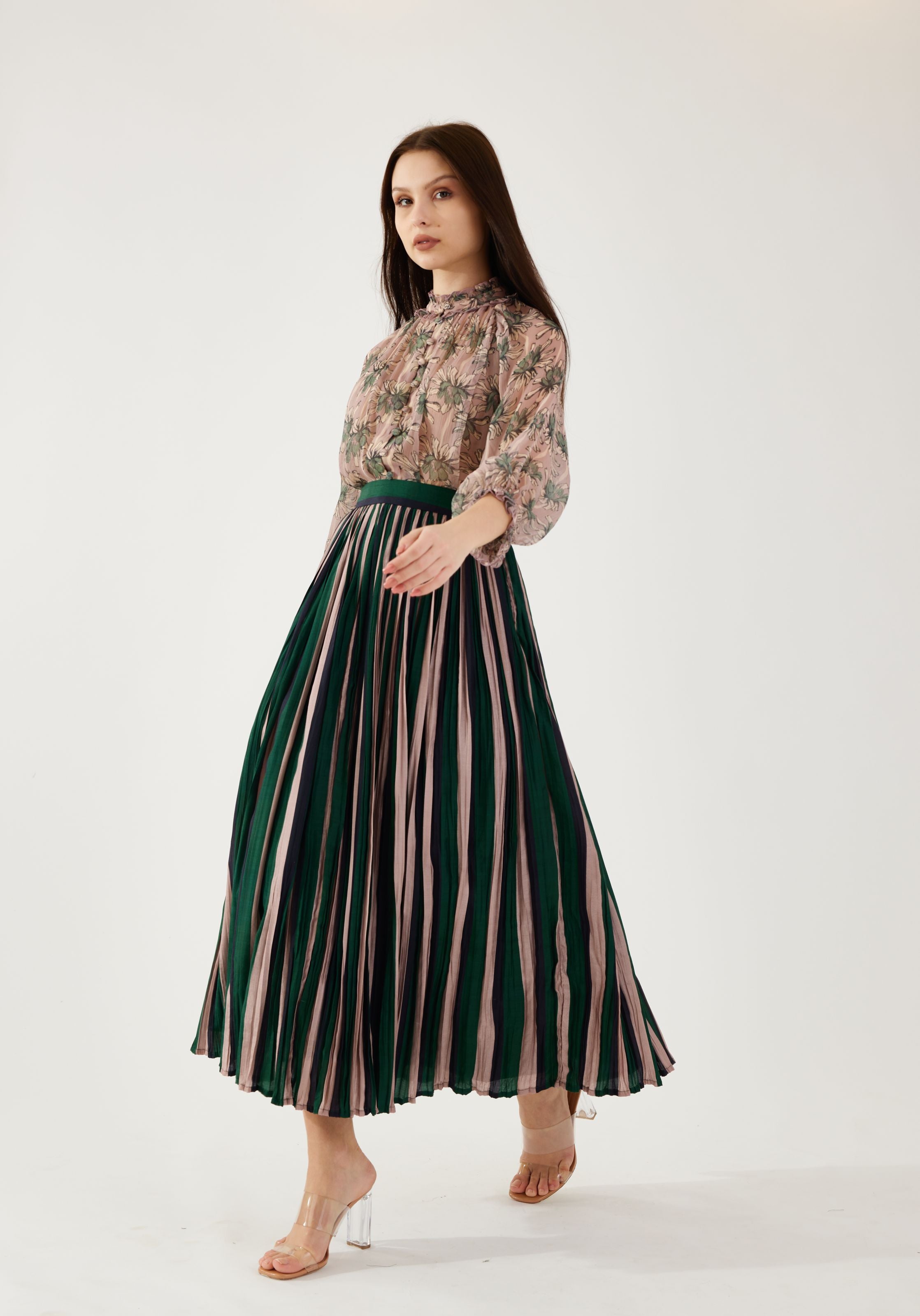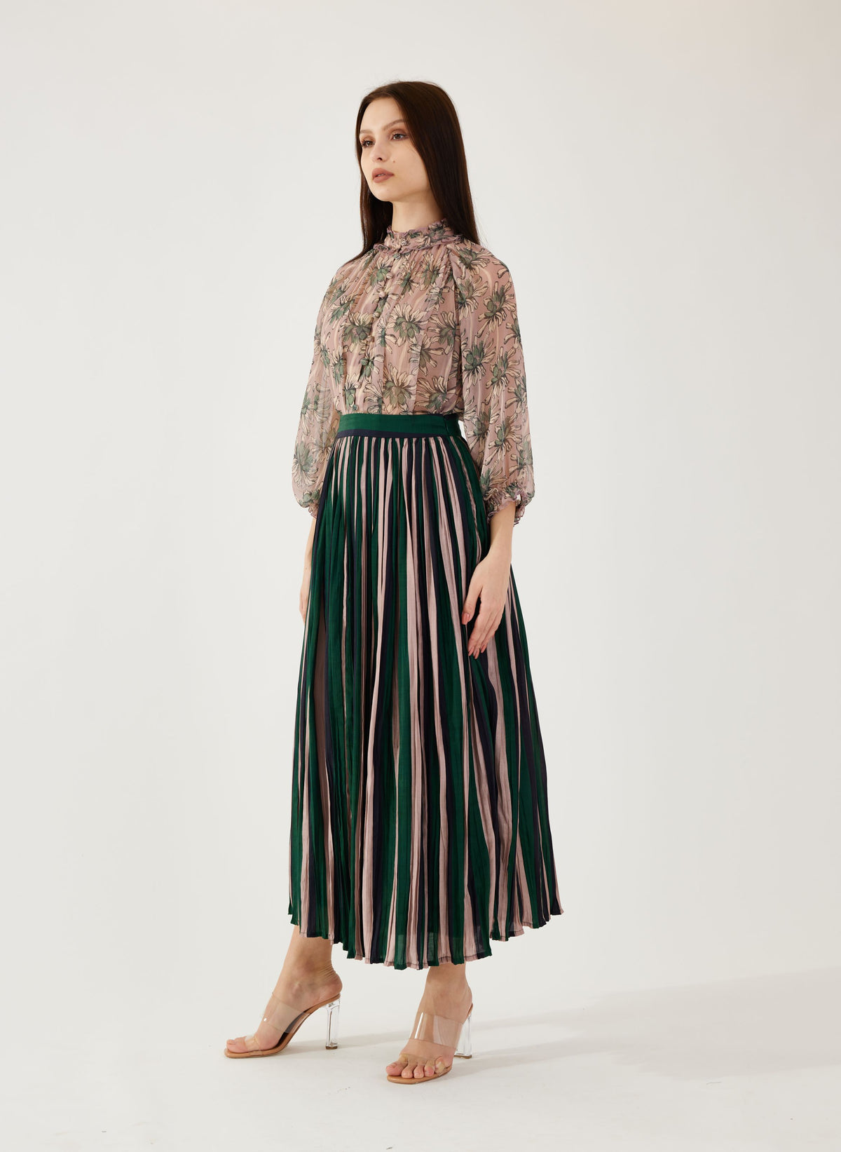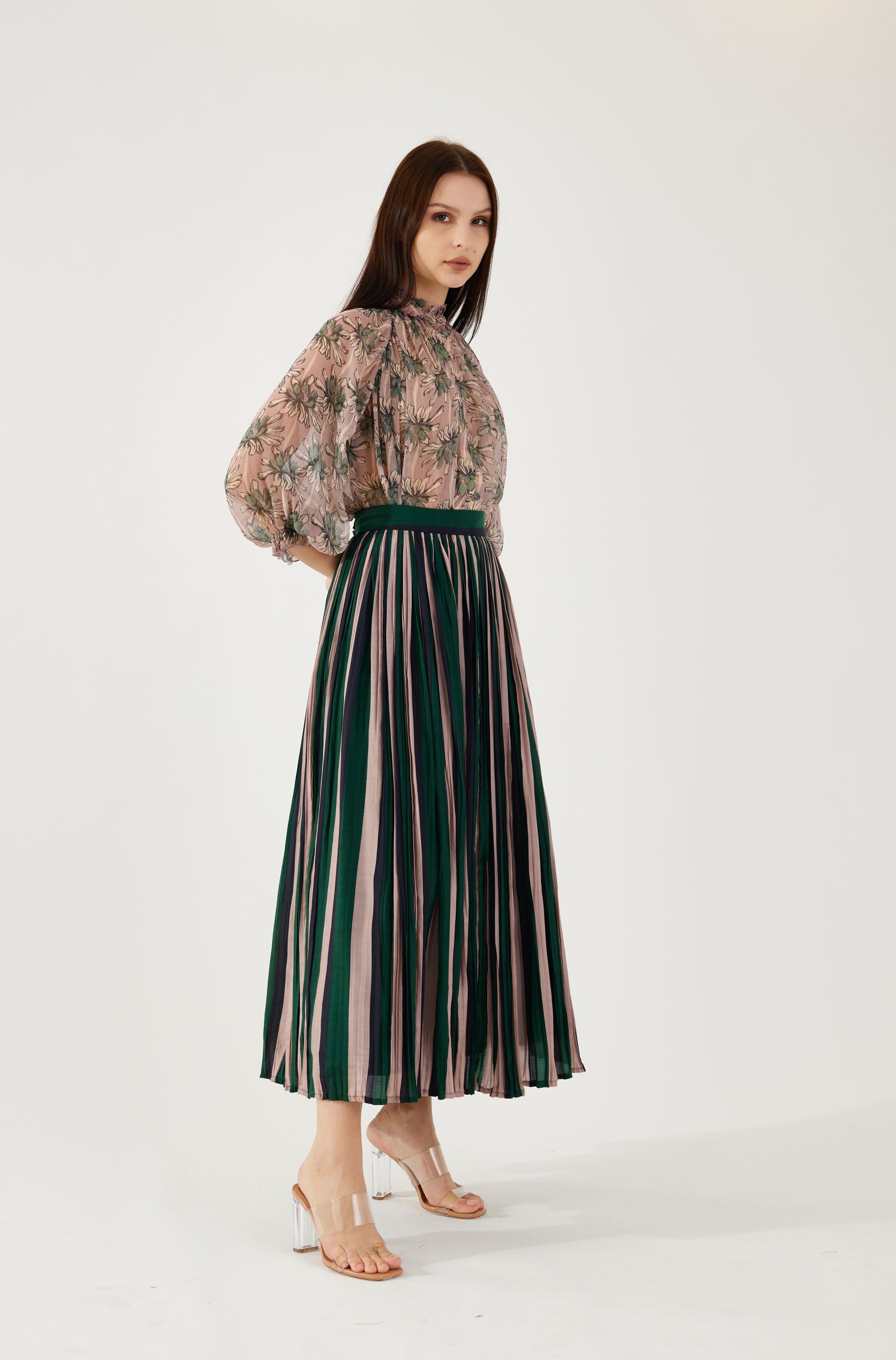 GREEN, PEACH AND BLACK STRIPE CRINKLED SKIRT
