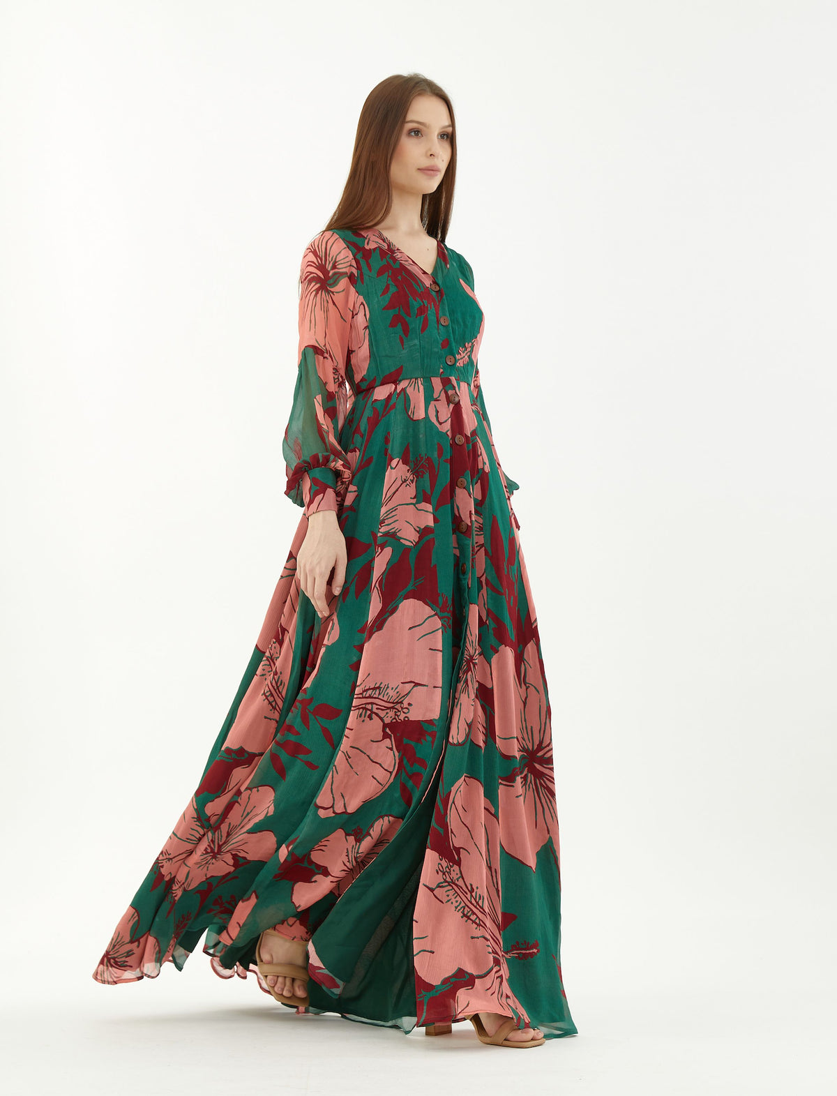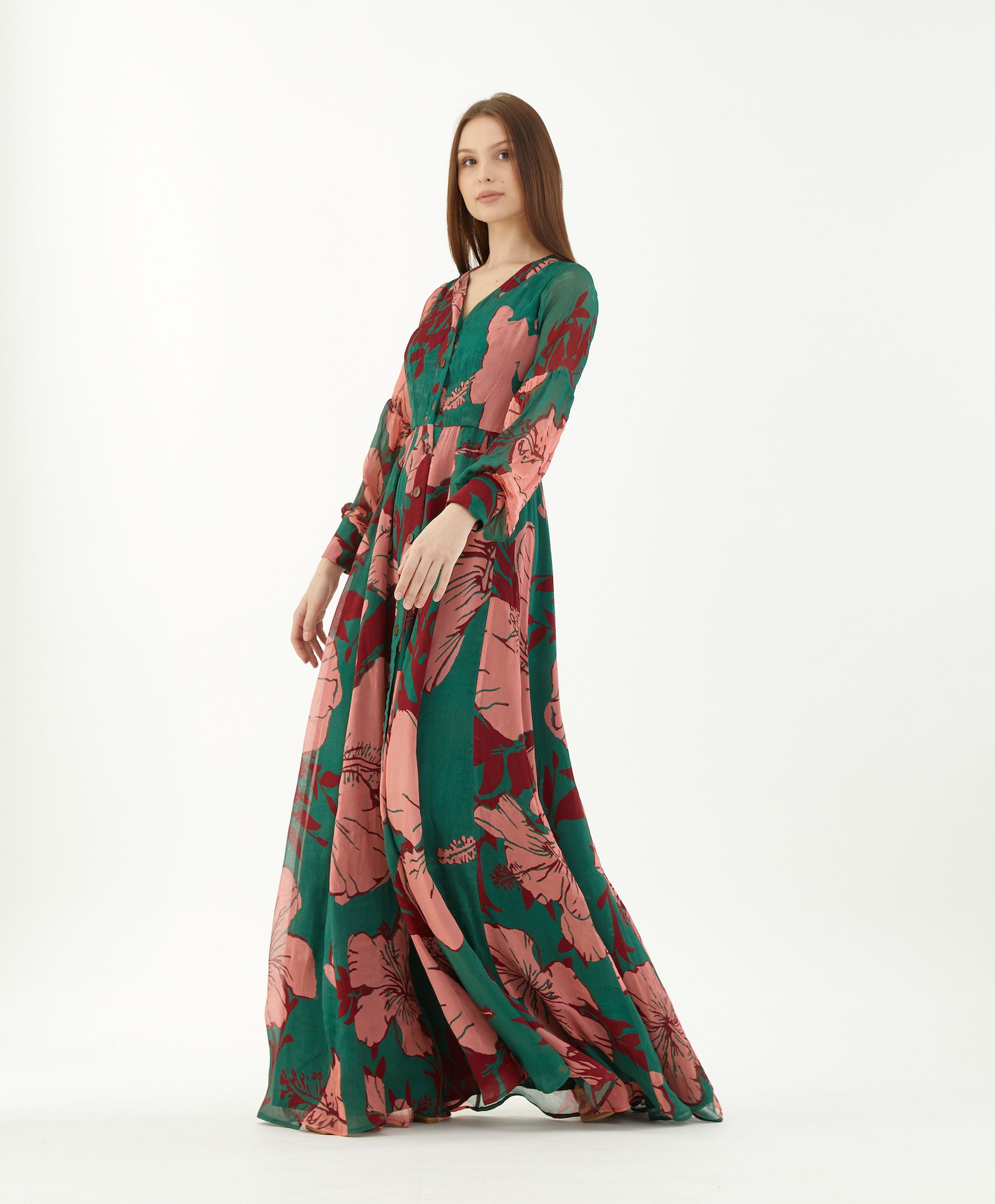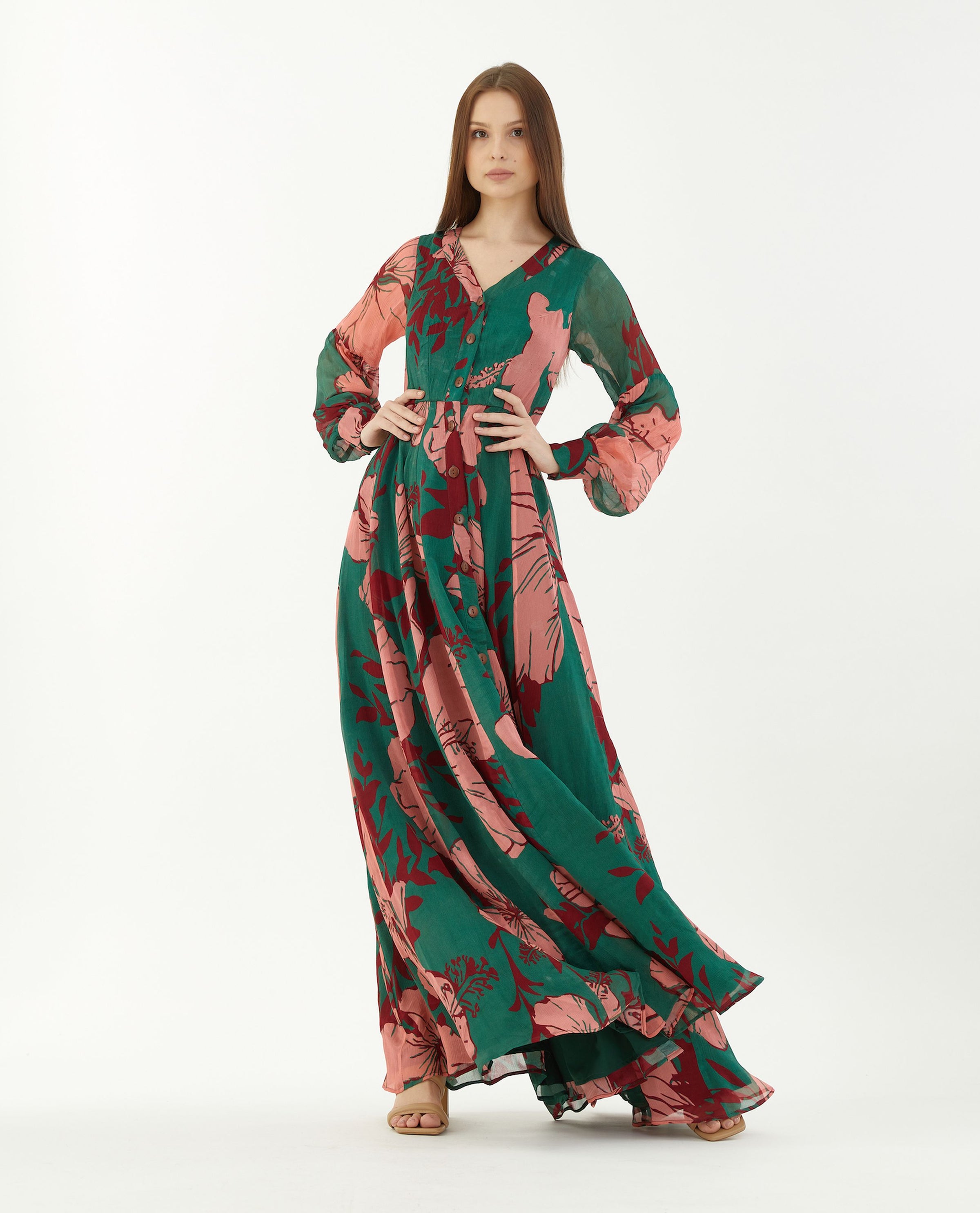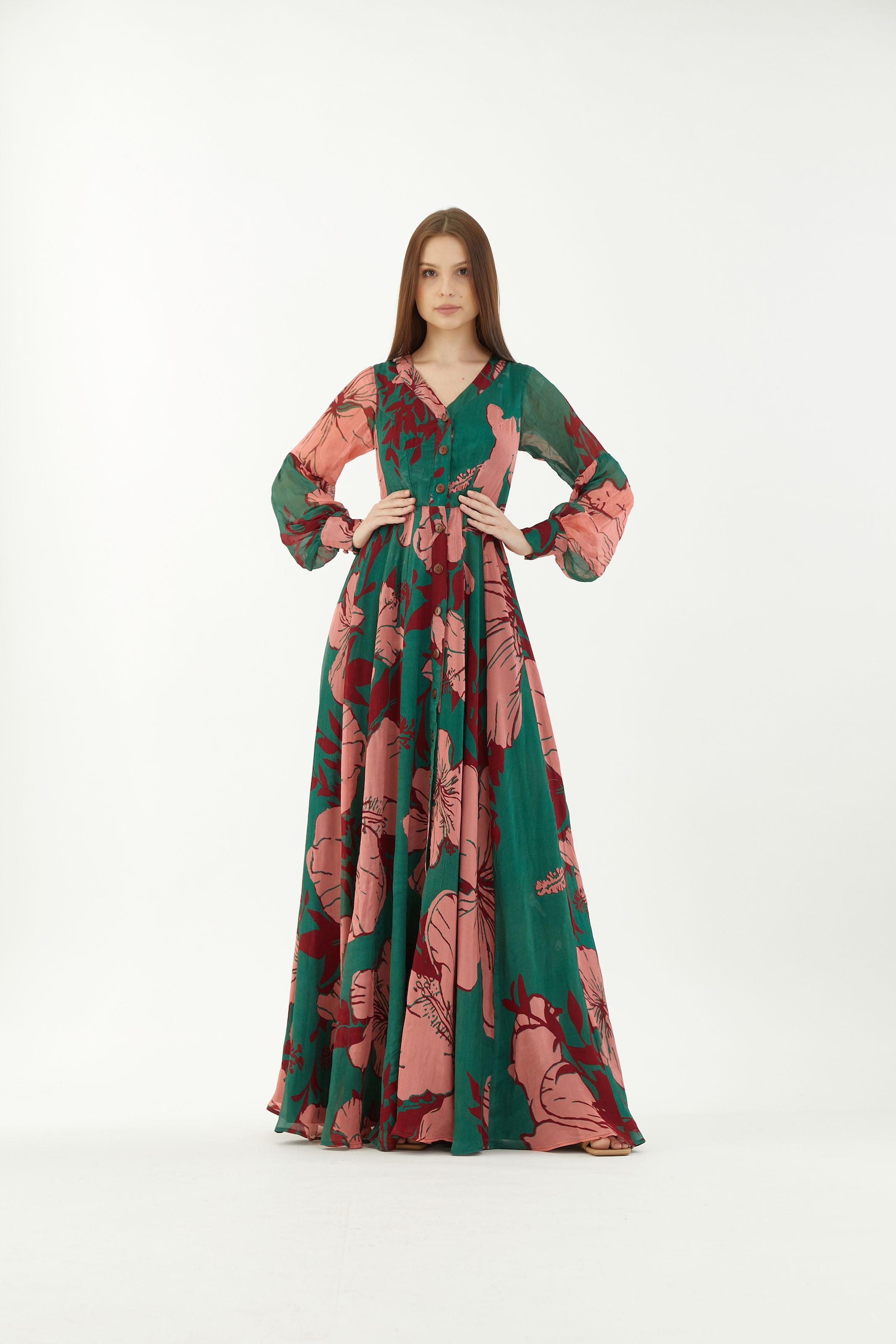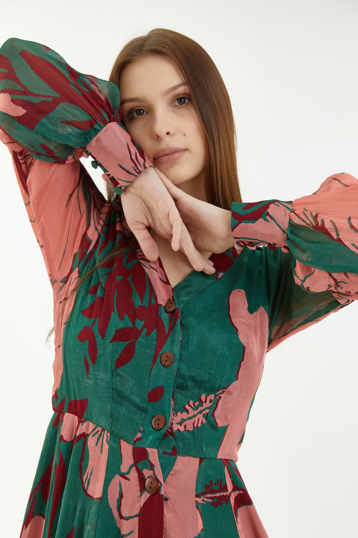 GREEN, PINK AND RED FLORAL LONG SHIRT DRESS