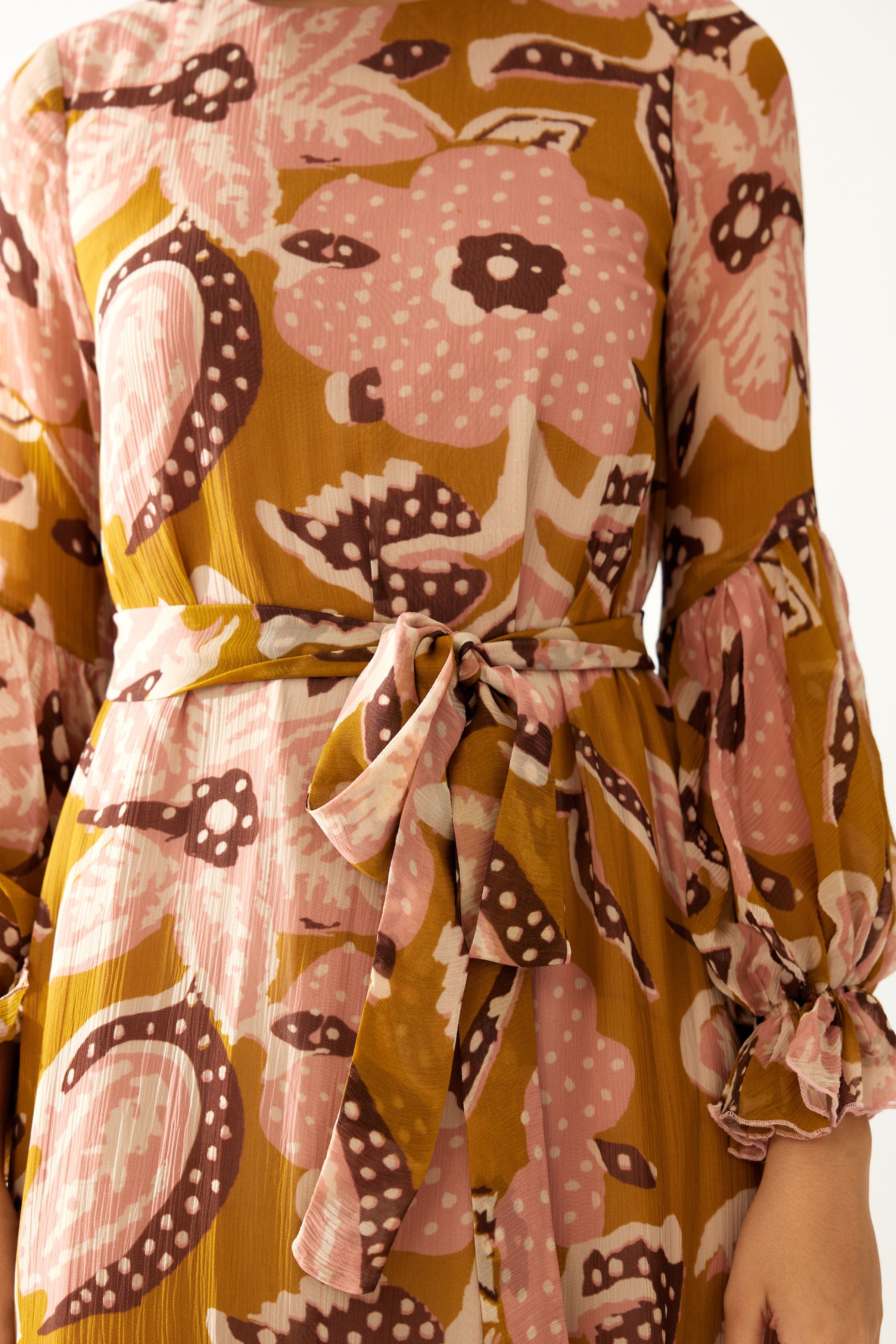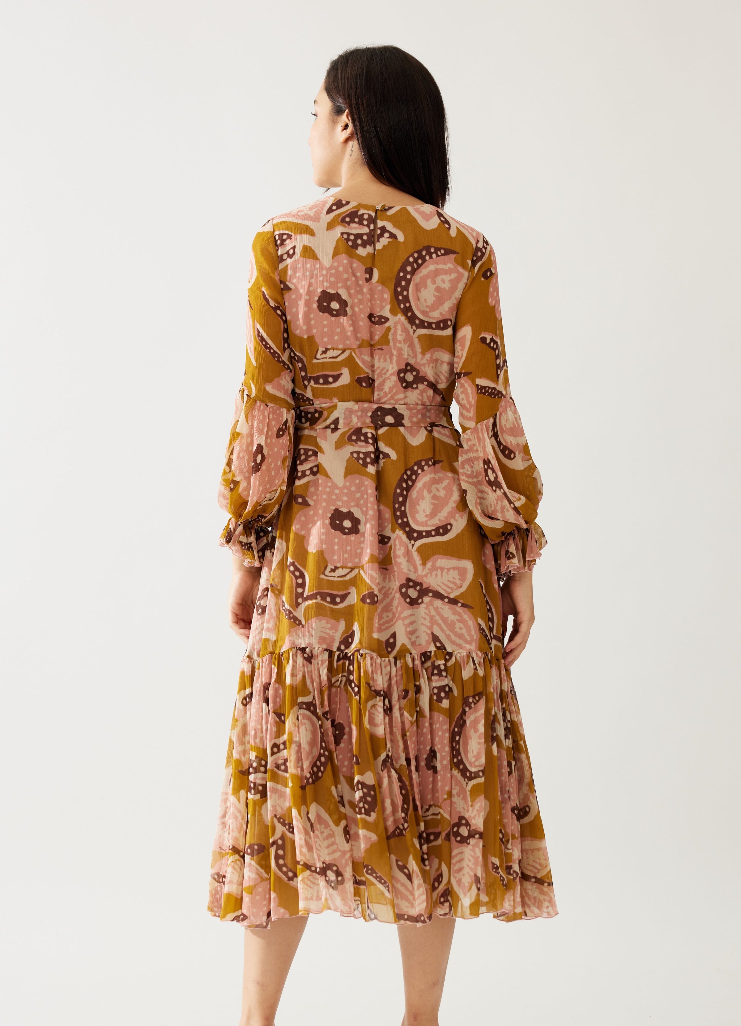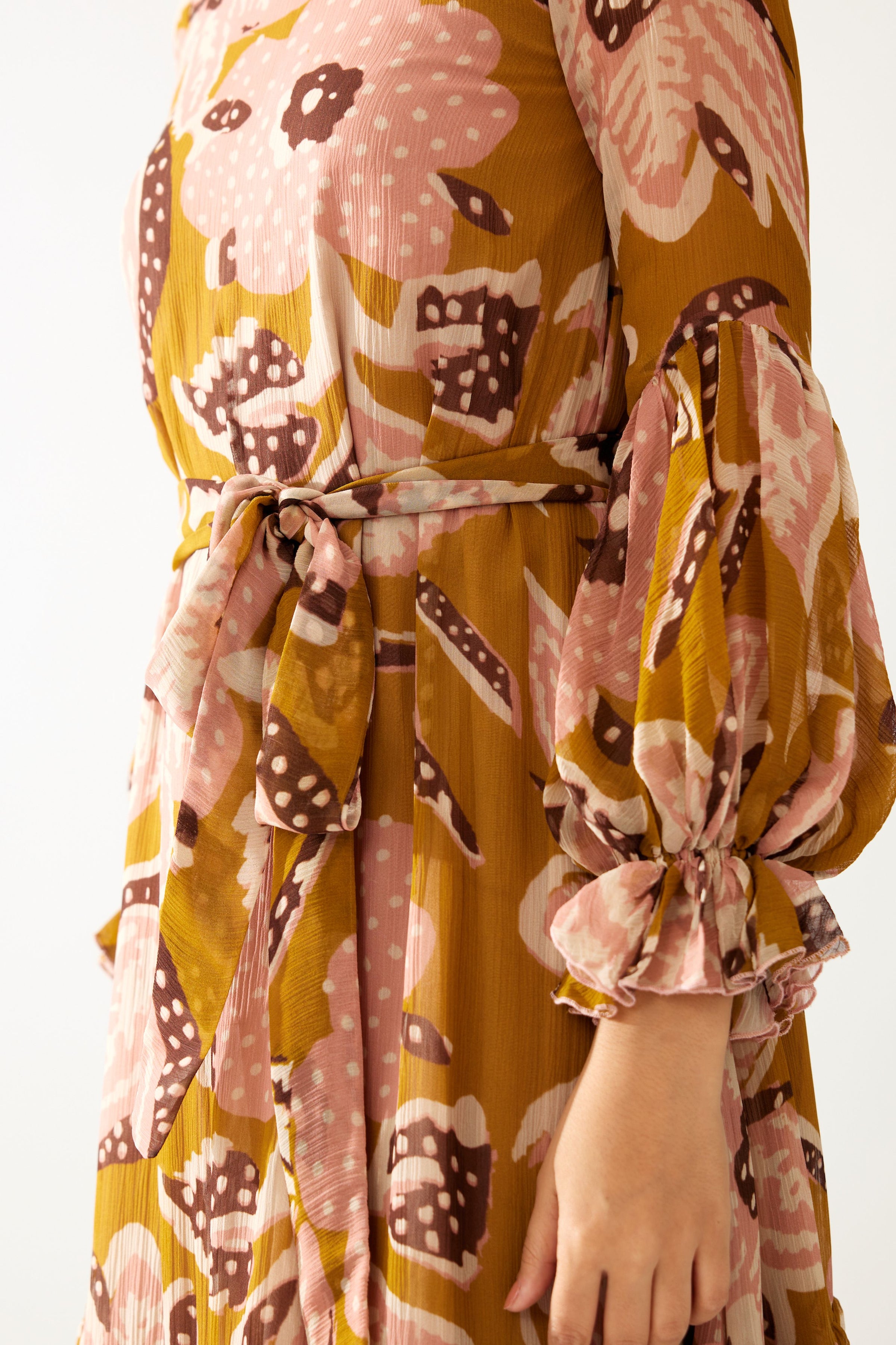 MUSTARD AND PINK FLORAL MIDI DRESS