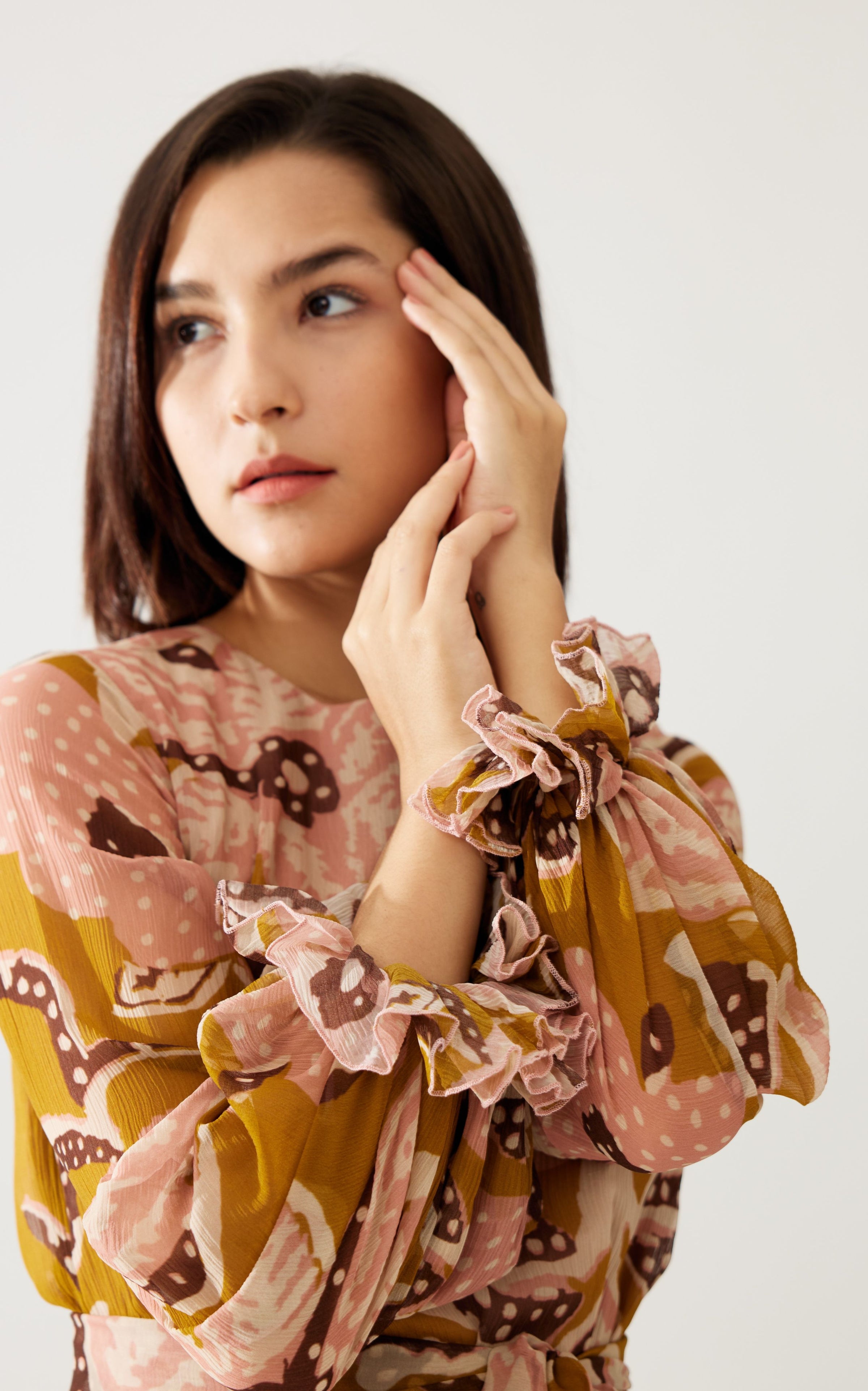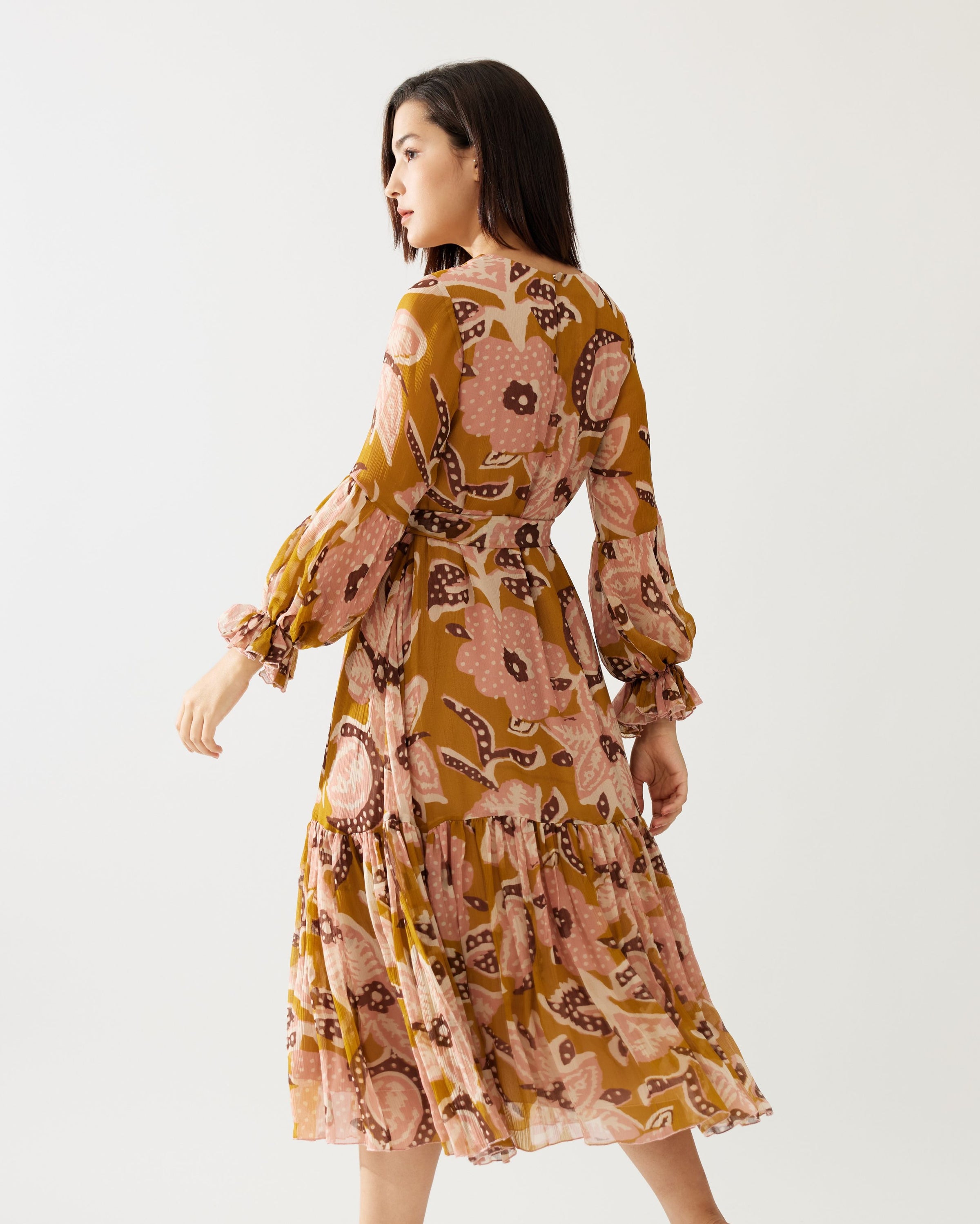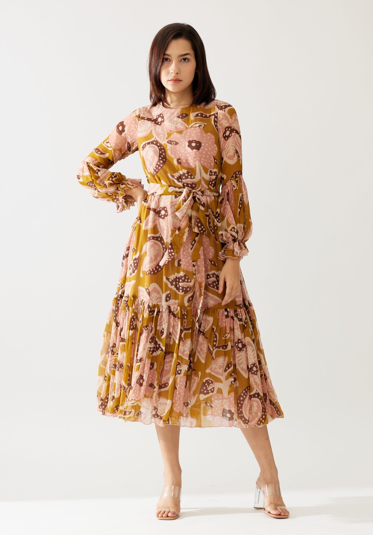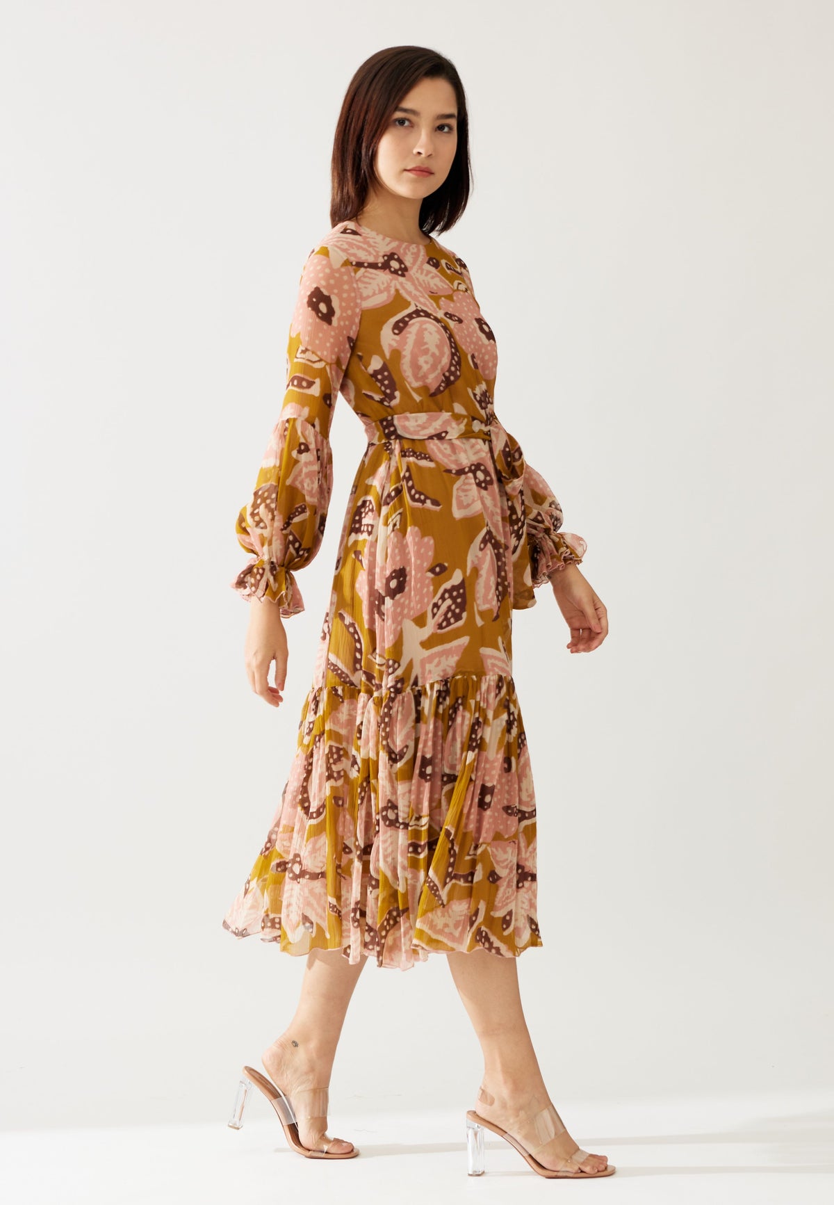MUSTARD AND PINK FLORAL MIDI DRESS