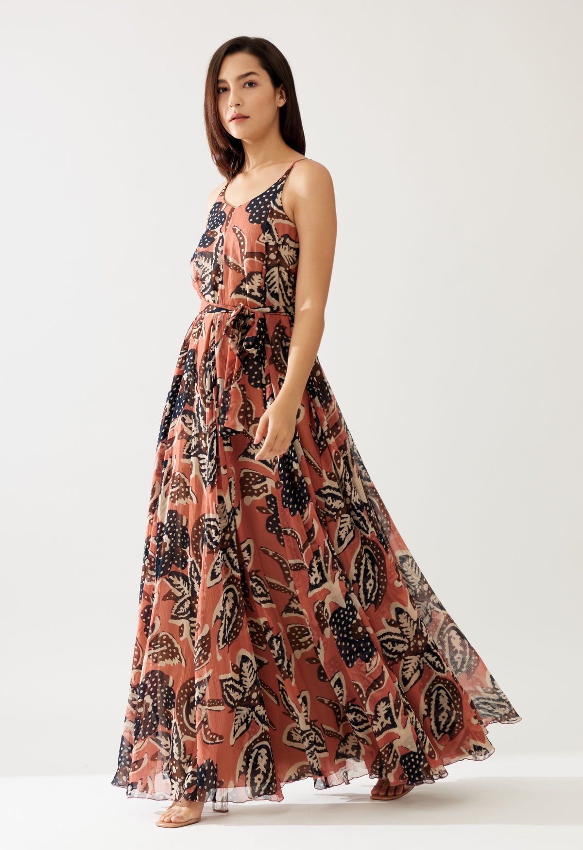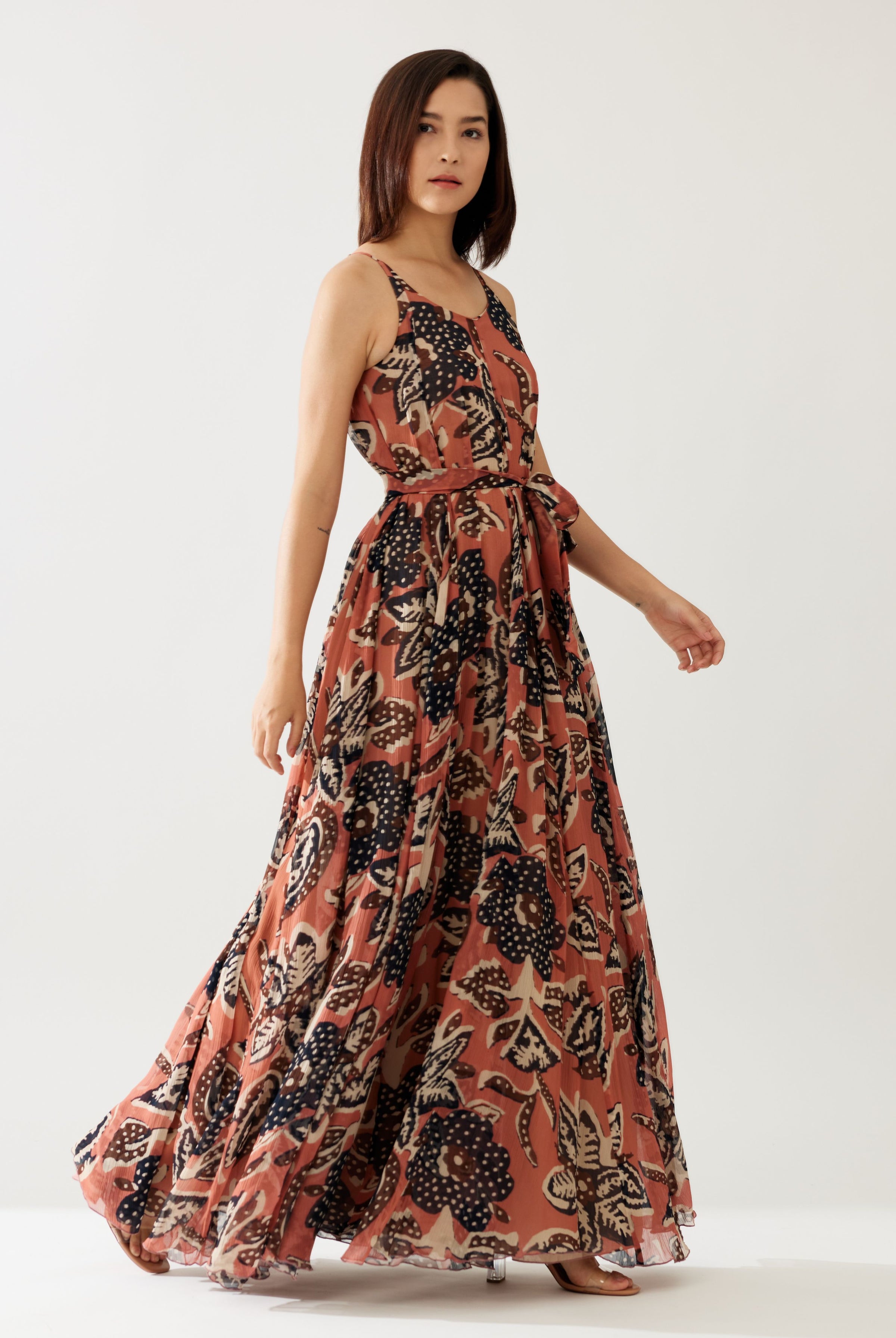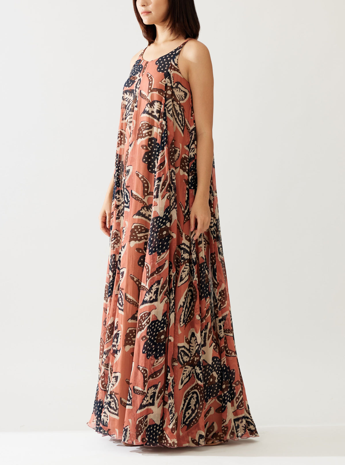 PINK AND DARK BLUE FLORAL SLEEVELESS LONG DRESS