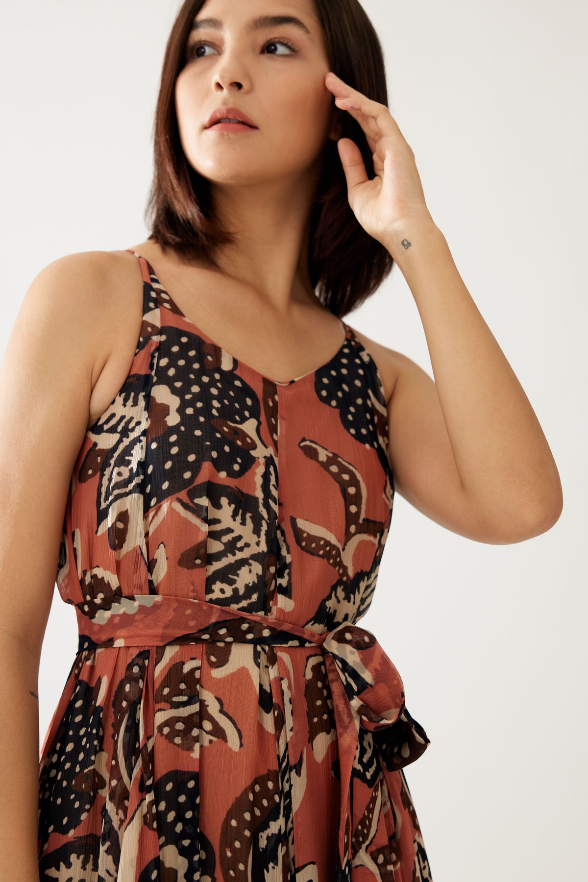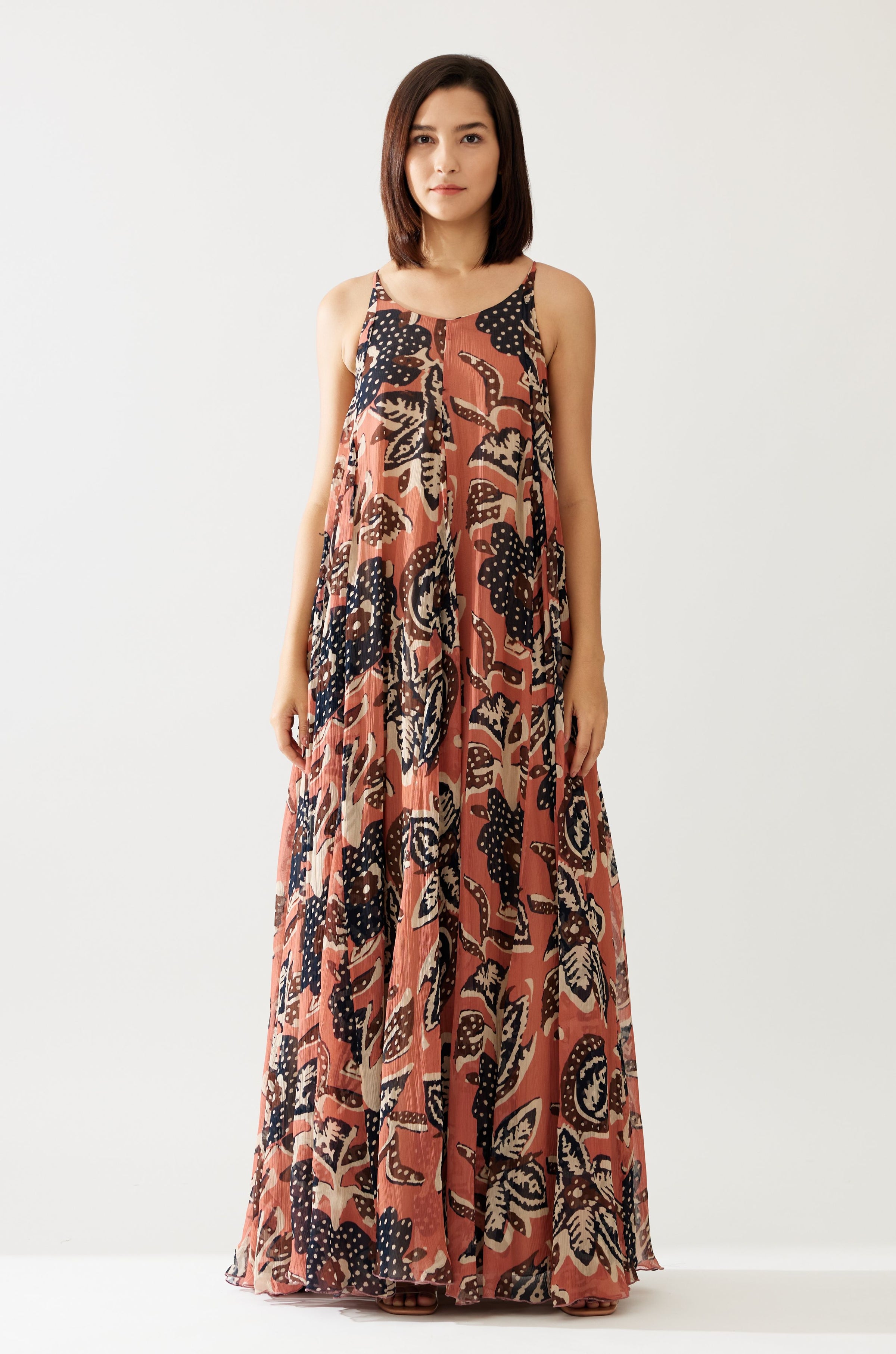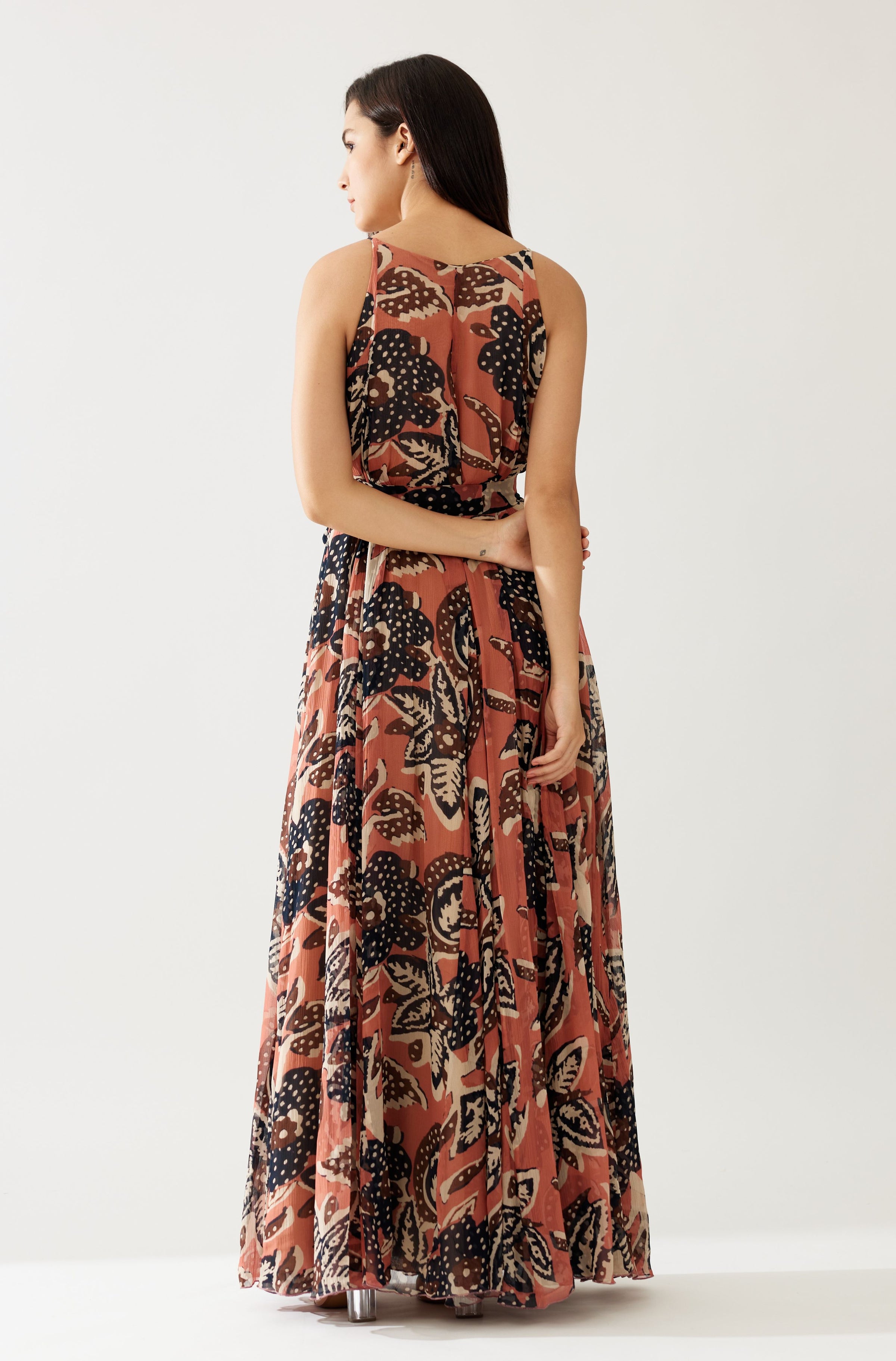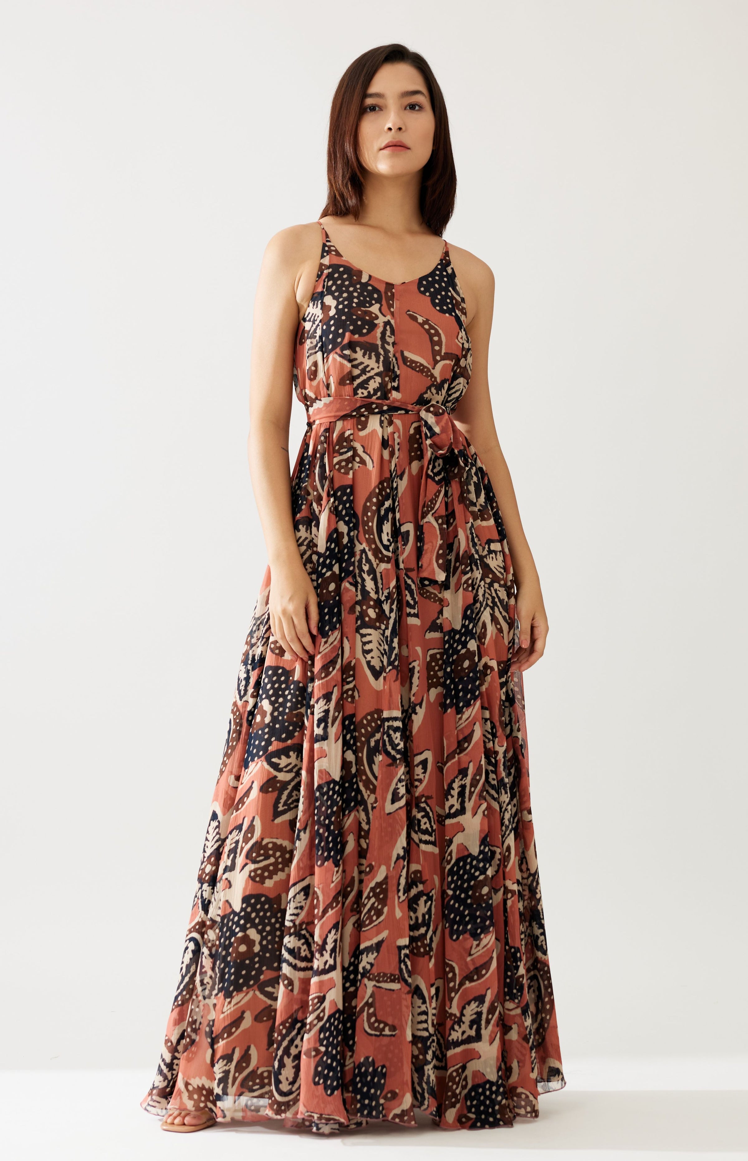 PINK AND DARK BLUE FLORAL SLEEVELESS LONG DRESS