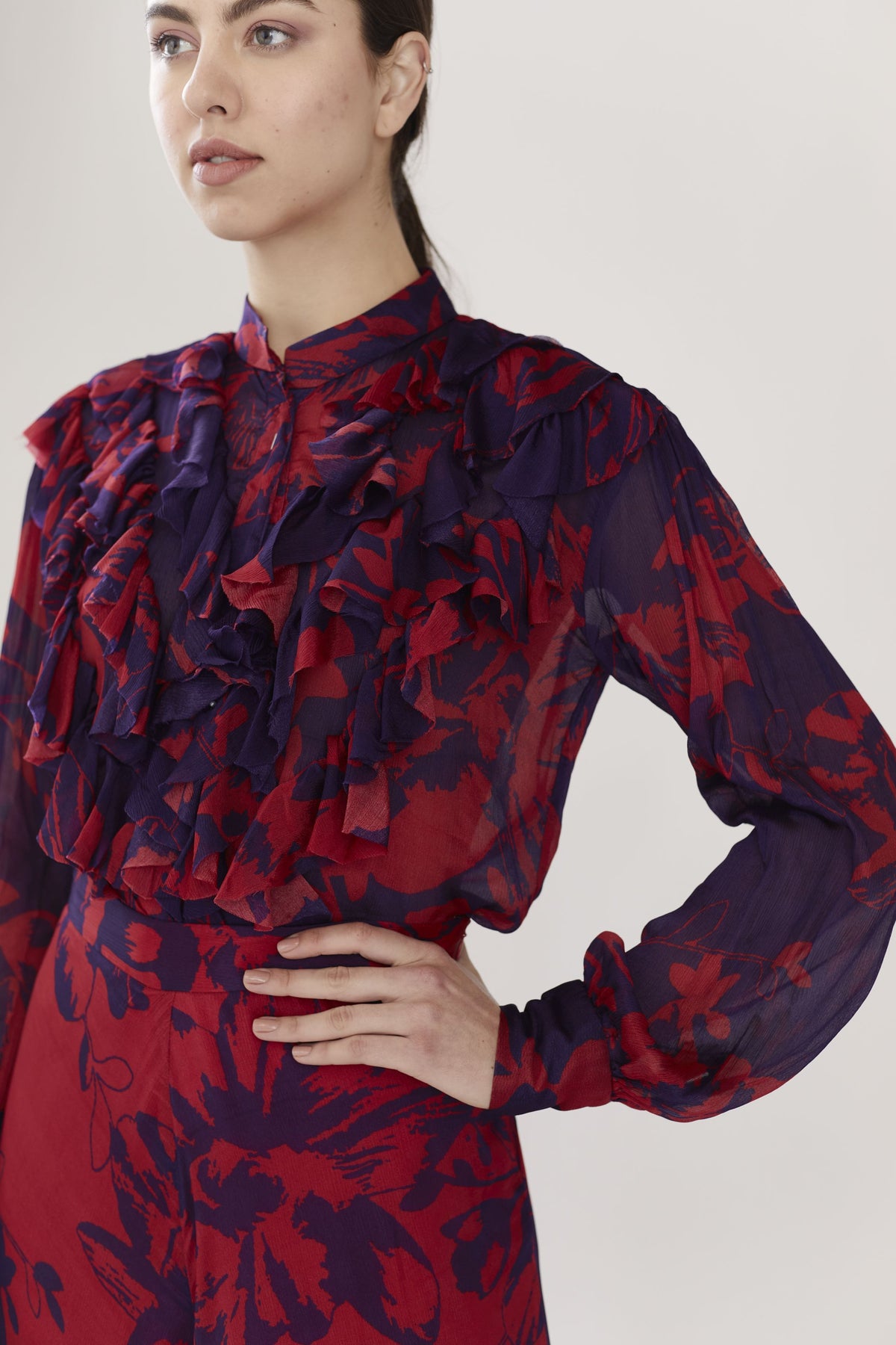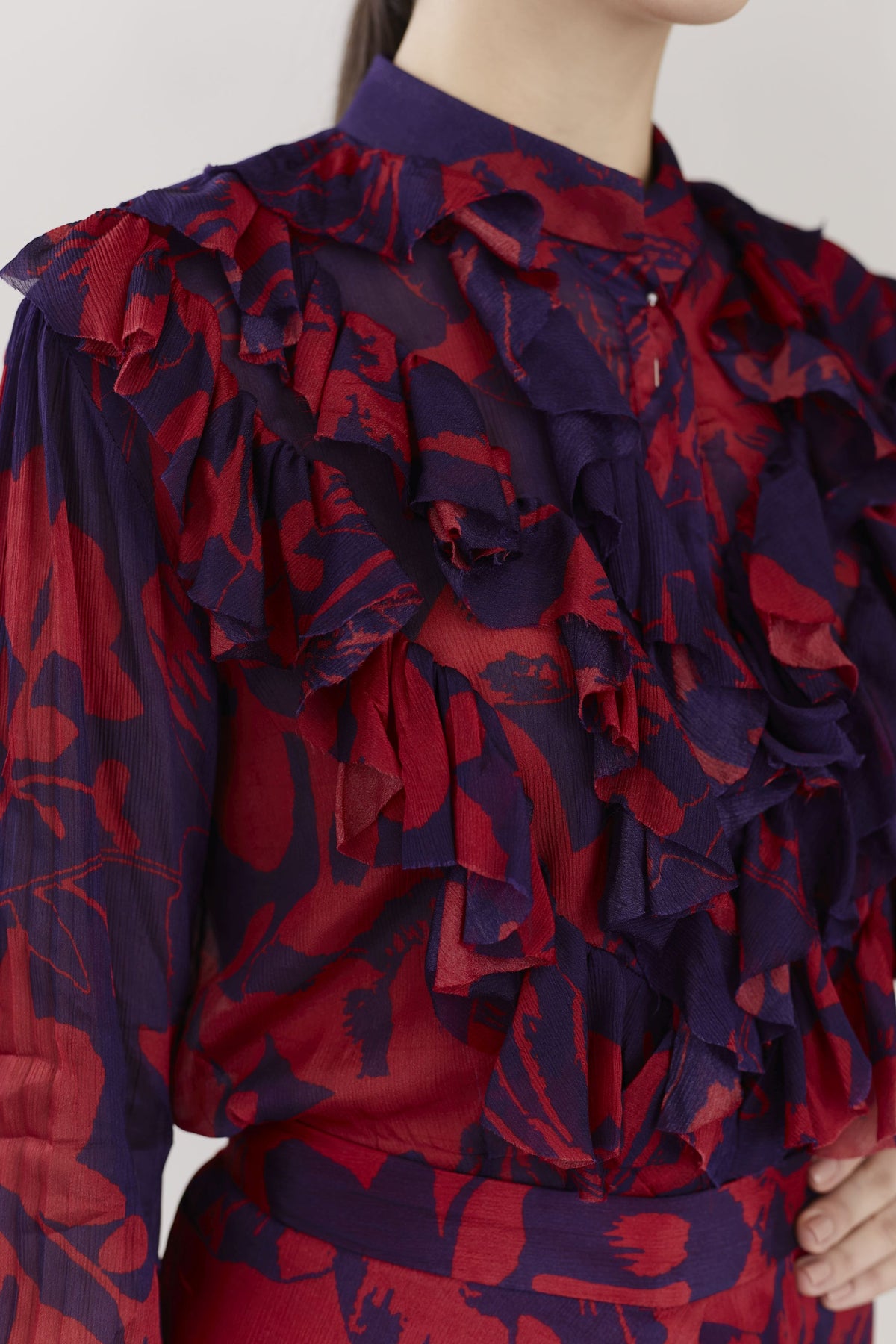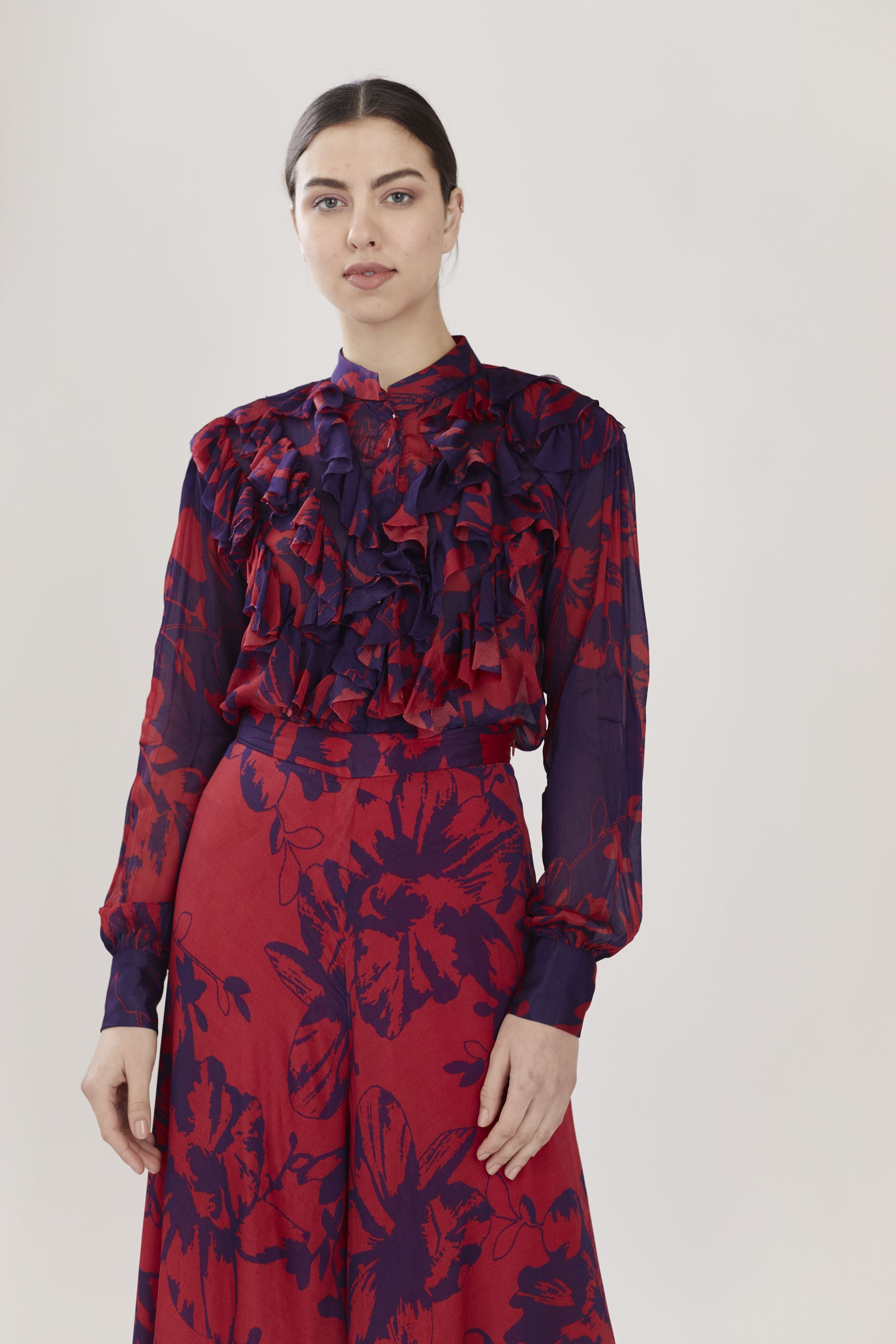 PURPLE AND RED FLORAL FRILL TOP